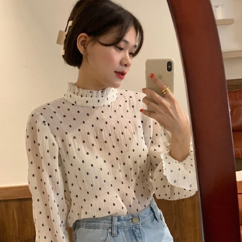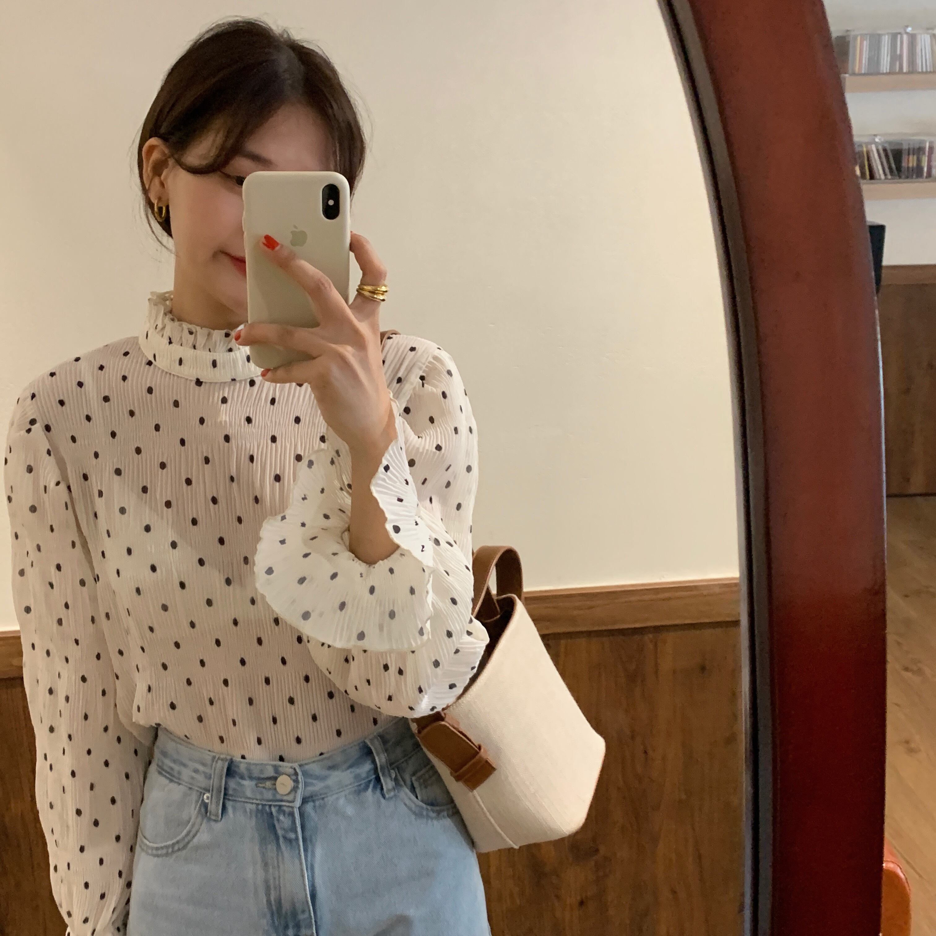 シャツ スプリングカラープリーツ水玉トップス スリーブシフォンレディース 春物 韓国婦人9845866547