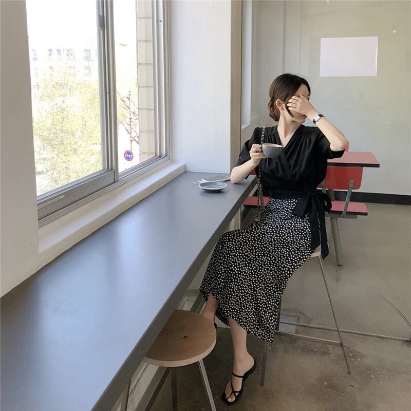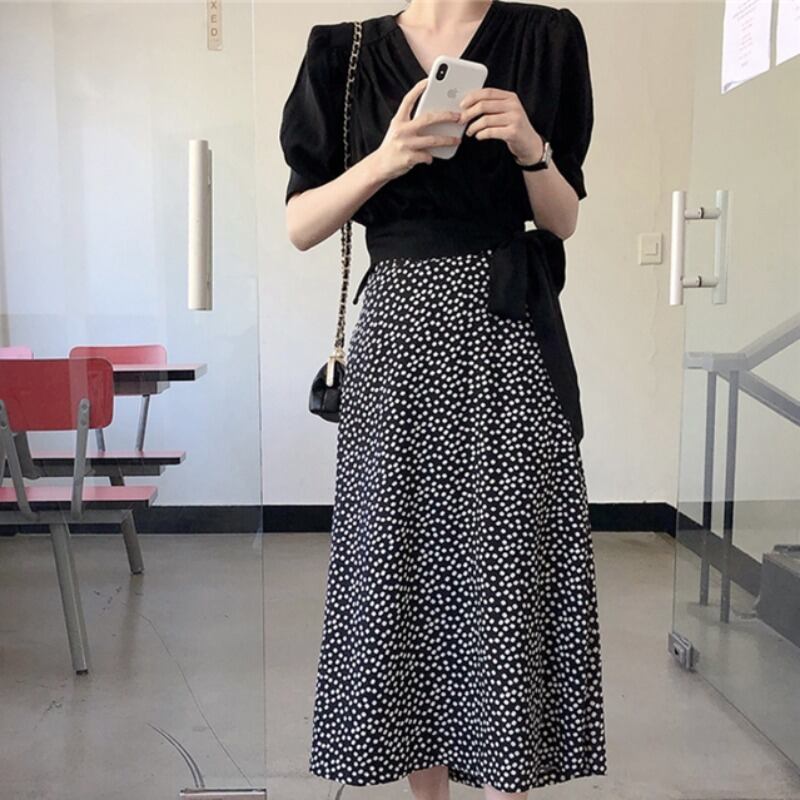 サマーVネックトップス 水玉シフォンスカート レディース 夏物 韓国婦人42545300370