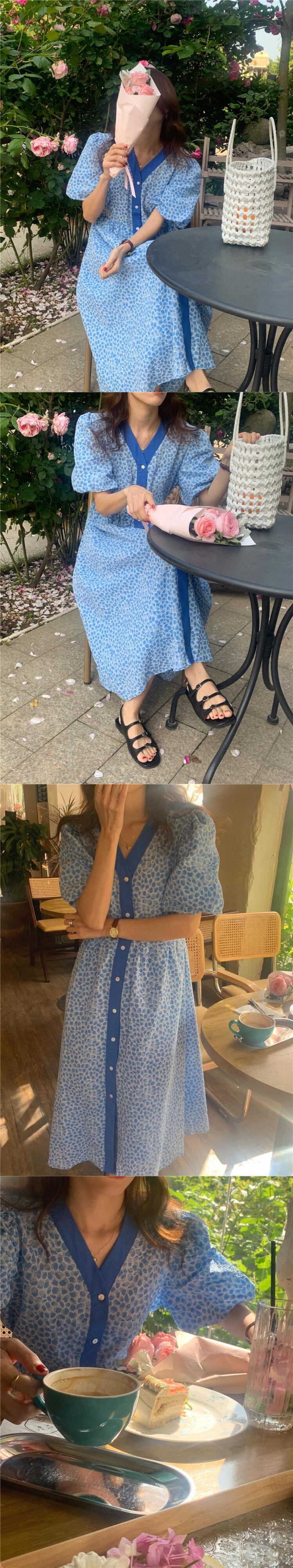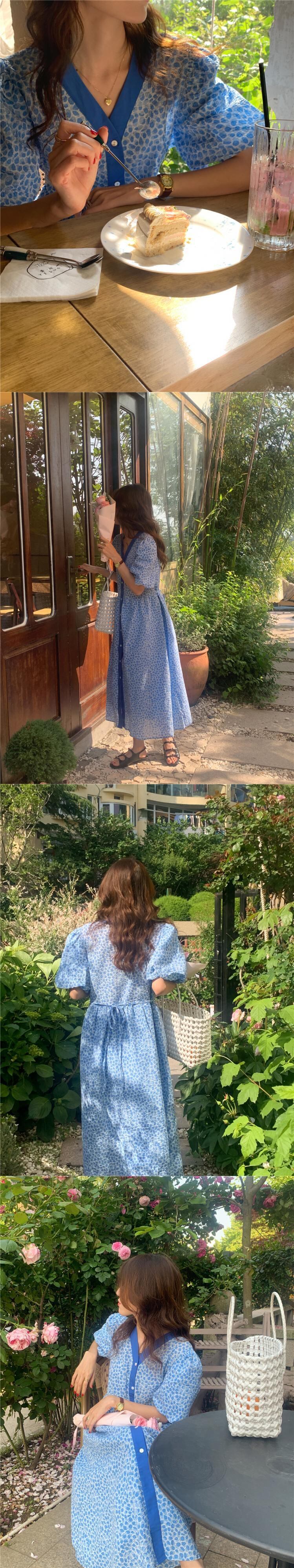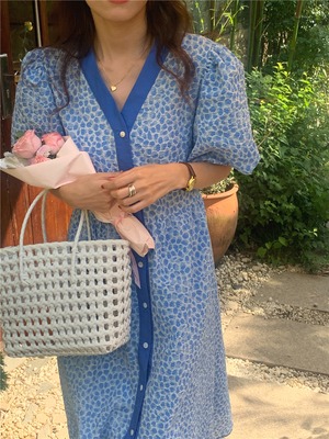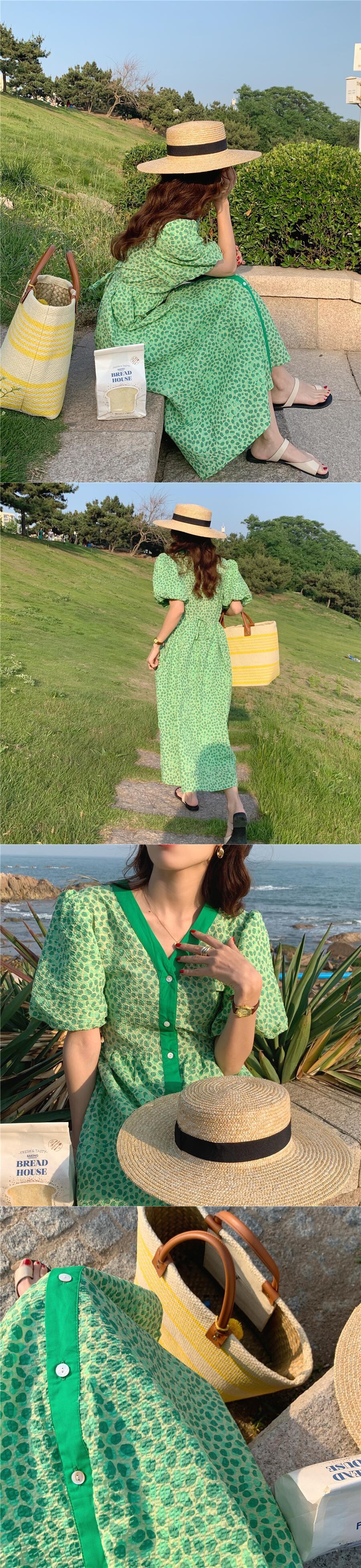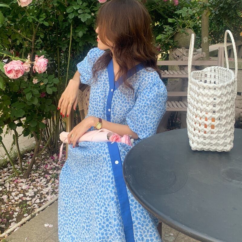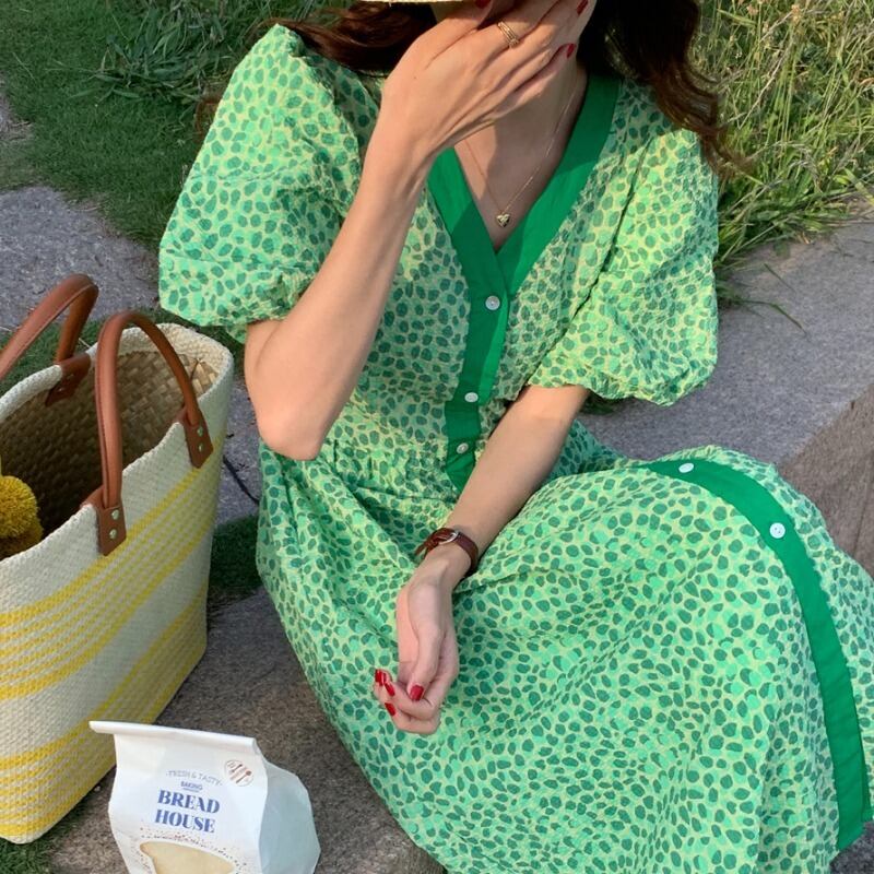 サマーカラーVネックスリーブプリント柄シフォンドレス ロングスカート 夏物 韓国婦人90469483692