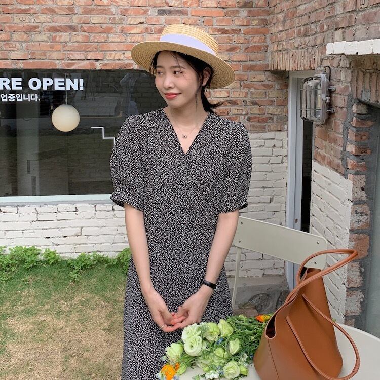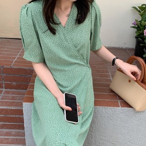 スタンダードフローラルワンピースレースドレス サマーVネックシフォンロングスカート レトロ 夏物 花柄 韓国婦人64050567865