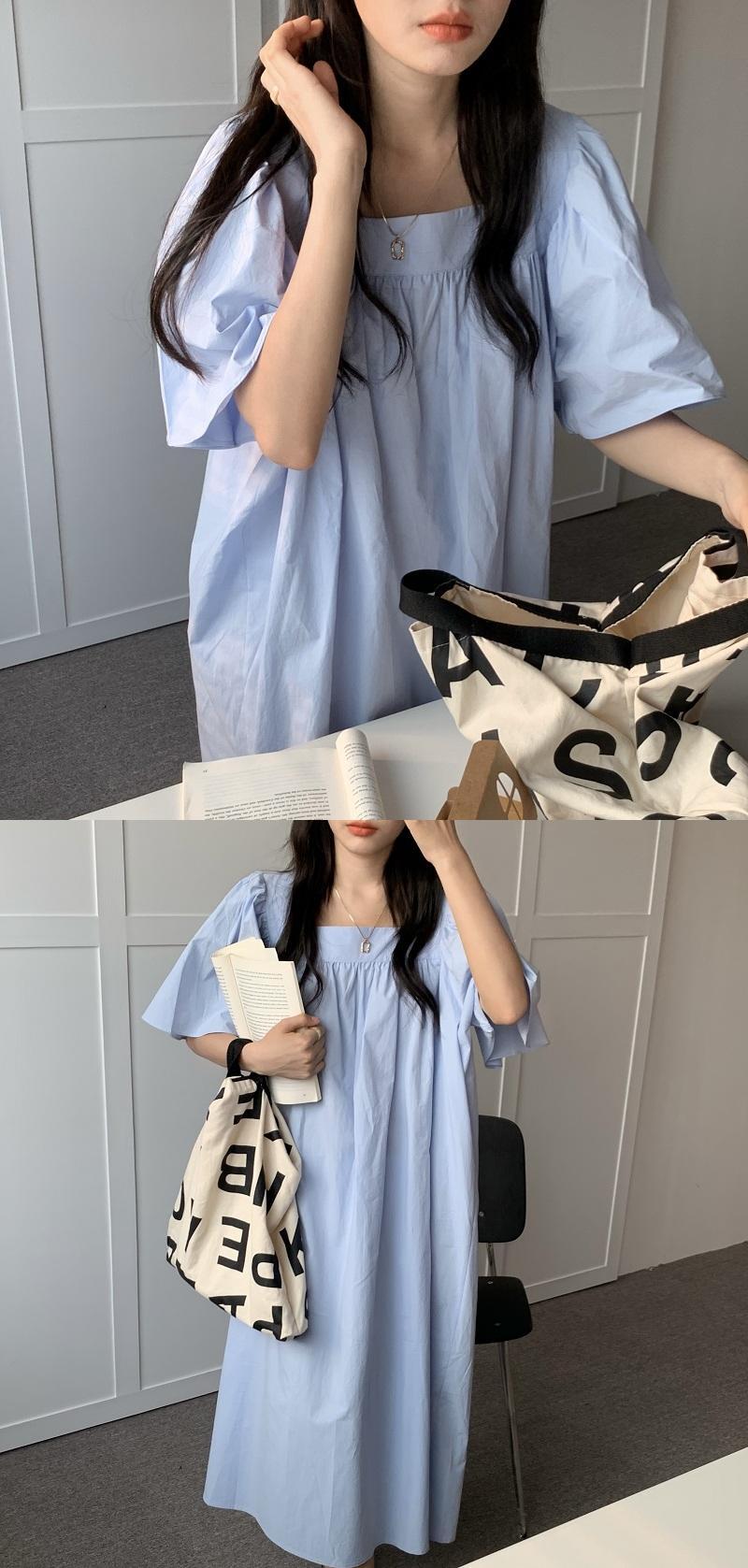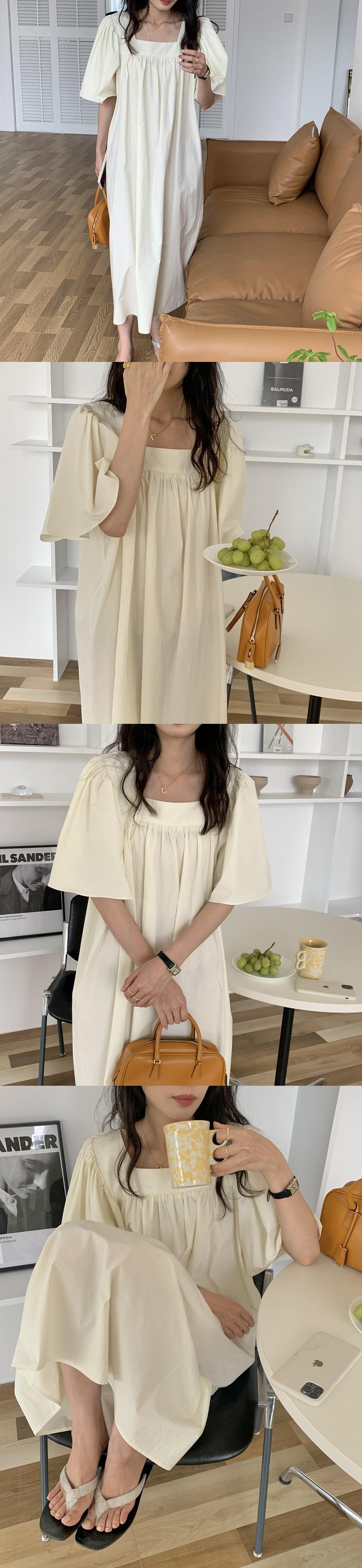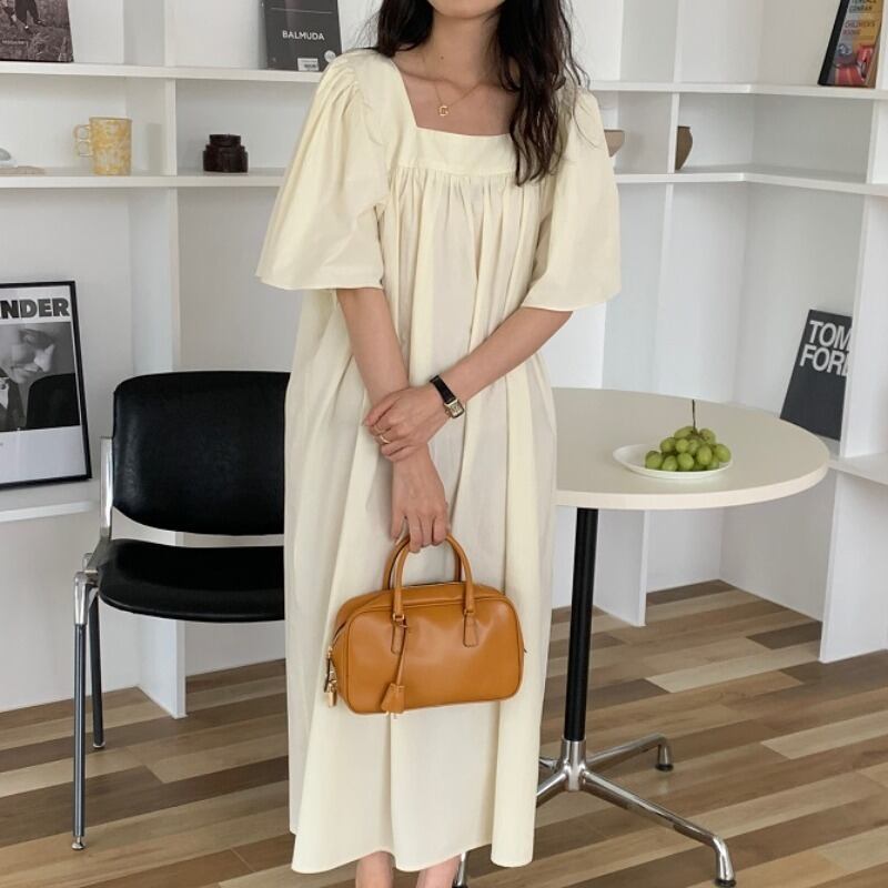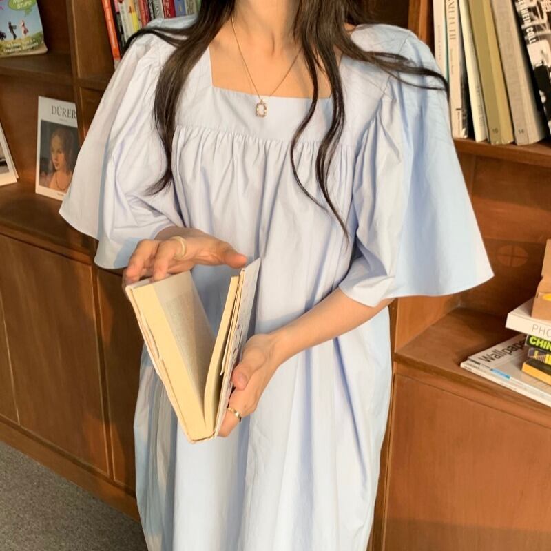 サマースタンダードカラールーズ薄手スリーブドレス ロングスカート レトロ 夏物 スクウェア 韓国婦人31566849392