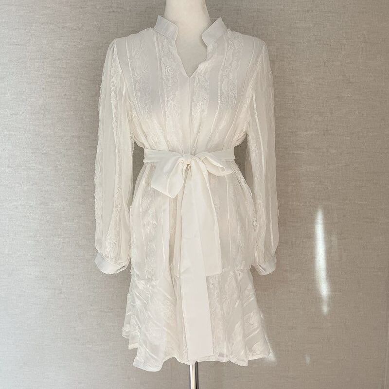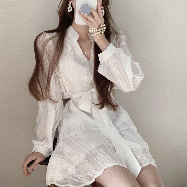 オータムスタイルVネックウェストジャカードシャツ ドレス ロング レース 秋物 レースアップ 韓国婦人96417700426