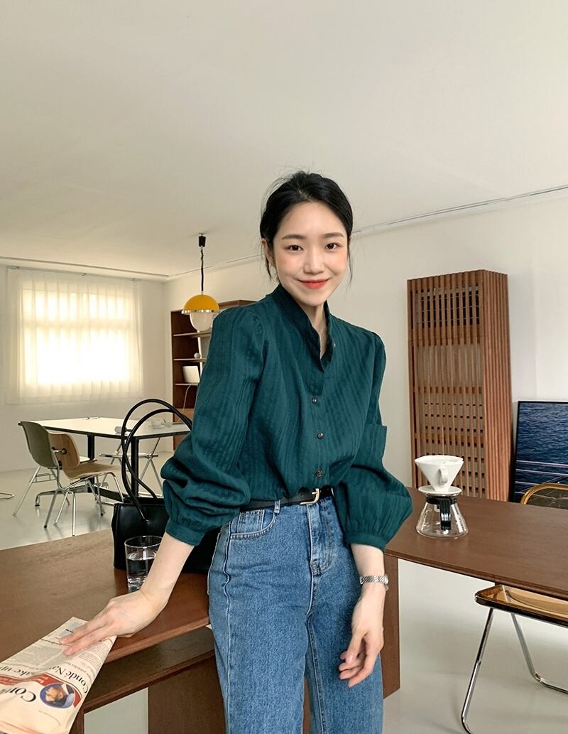 オータムホワイトカラースリーブストライプシャツ ブラウス レディース 秋物 韓国婦人74478035159