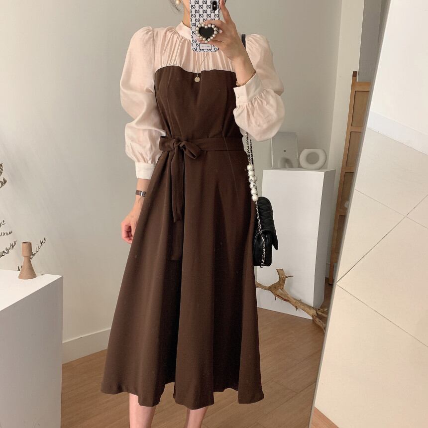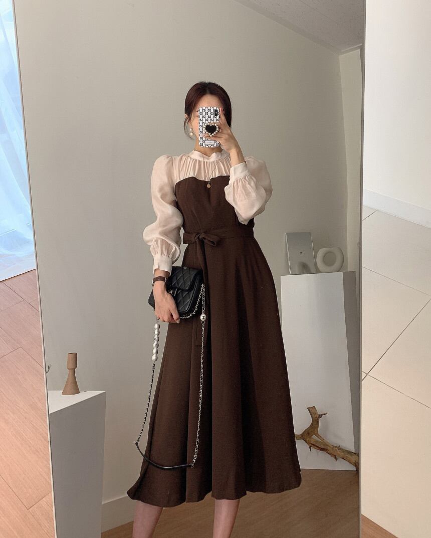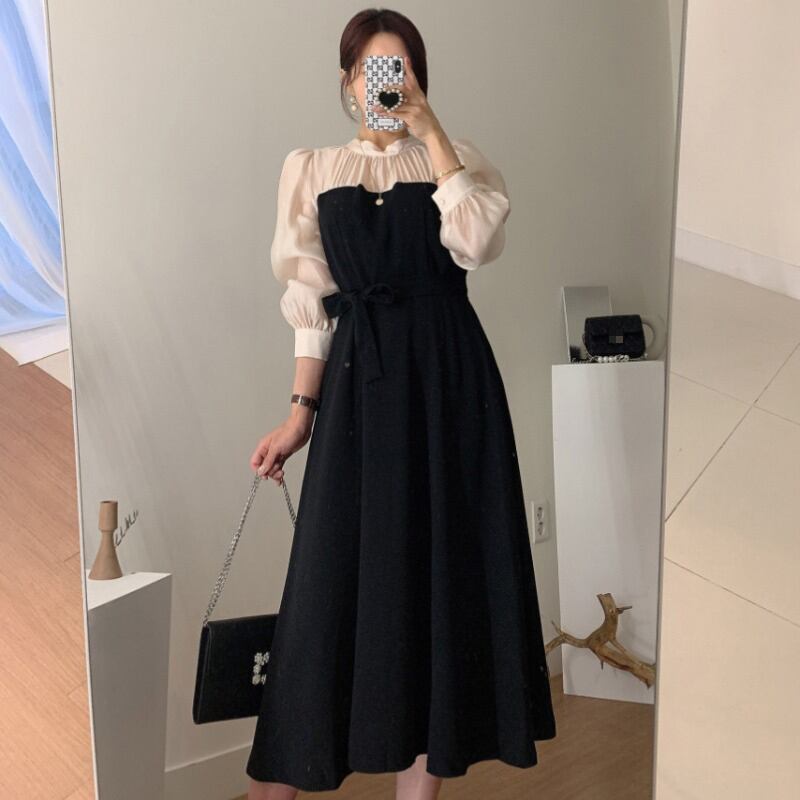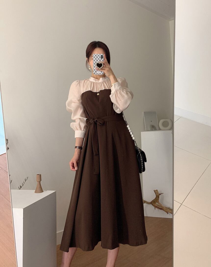 オータムウェストベルト カラーロングドレス レディース エレガント 秋物 ハーネス 韓国婦人64860406146