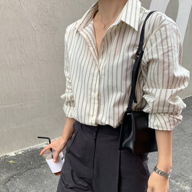 オータムスタイルカジュアルルーズストライプシャツ レディース ロング 秋物 韓国婦人44497814144