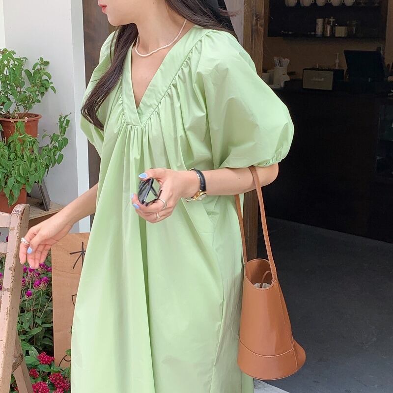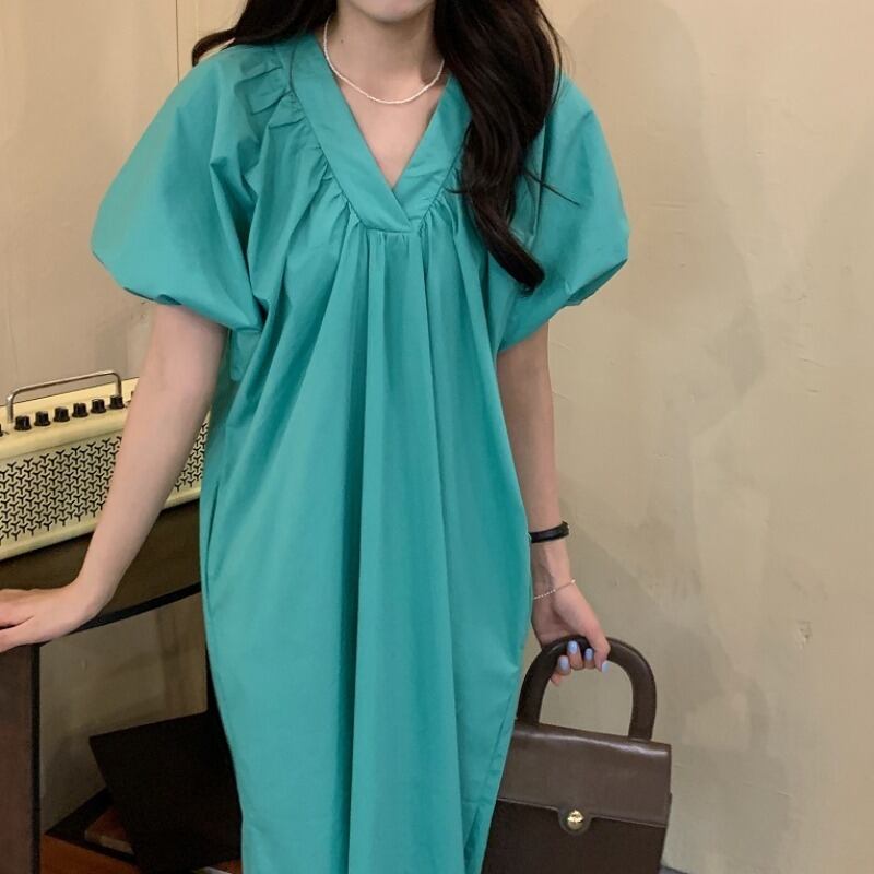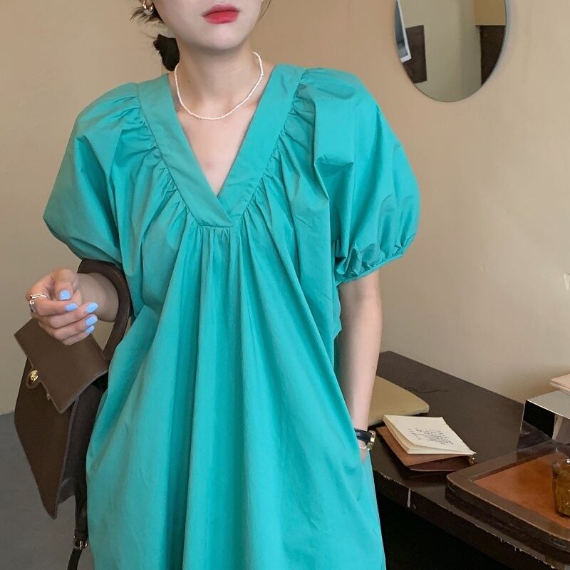 サマーVネックルーズ薄手スリーブドレス レディース 夏物 韓国婦人90459785723