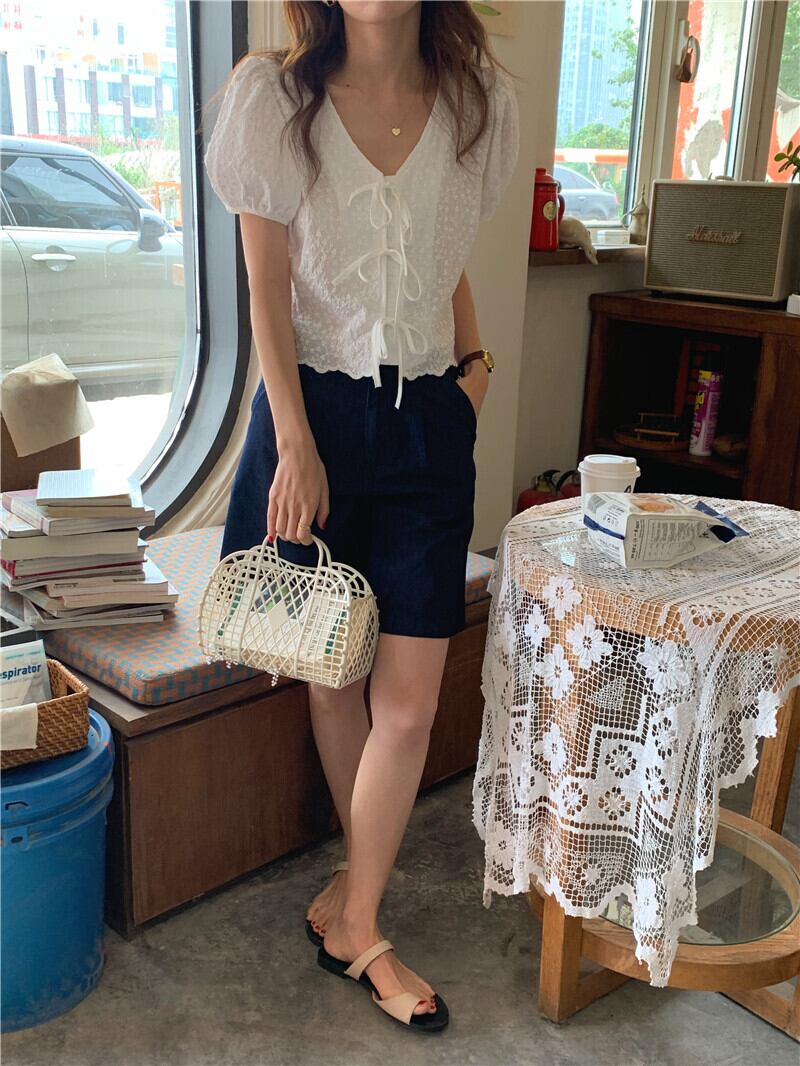 刺繍レースVネックスリーブジャカードホワイトシャツ ショートトップス レディース 大人ガーリー スウィート キュート カジュアル 韓国婦人58032354868