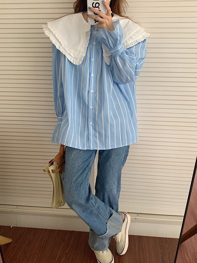 オータムスタイルカラーカジュアルスリーブストライプシャツ レディース 大人ガーリー スウィート キュート 秋物 韓国婦人97951003871