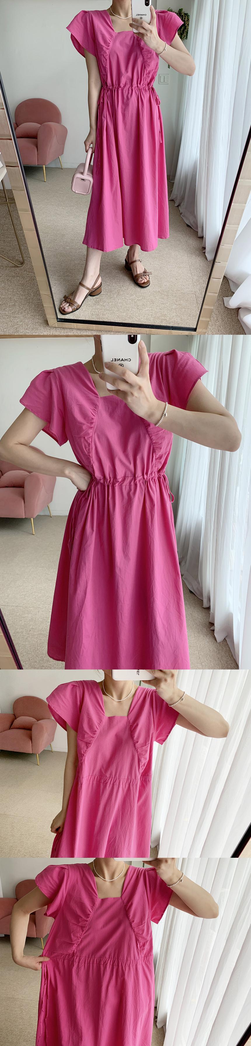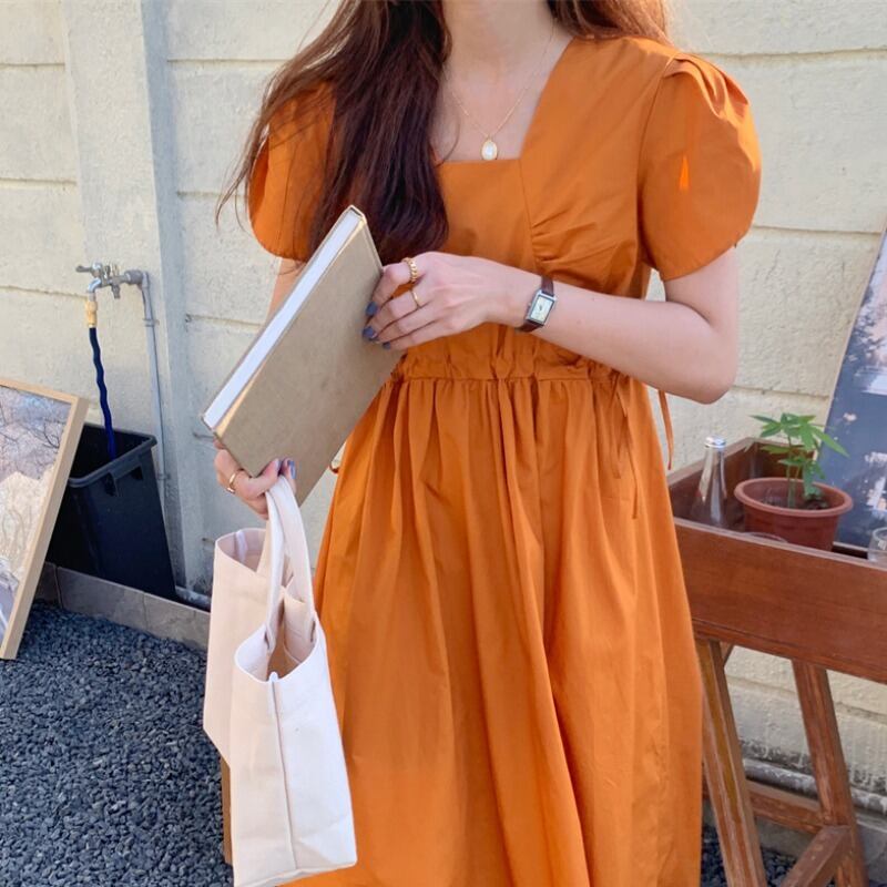 サマースタイルカラーホワイトウェストギャザープリーツドレス ロングスカート 夏物 スクウェア 韓国婦人96115890052