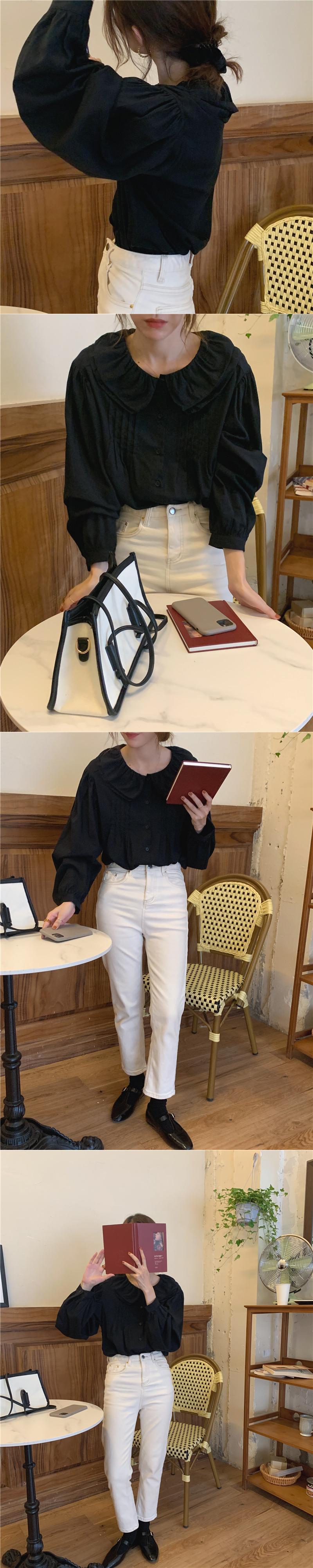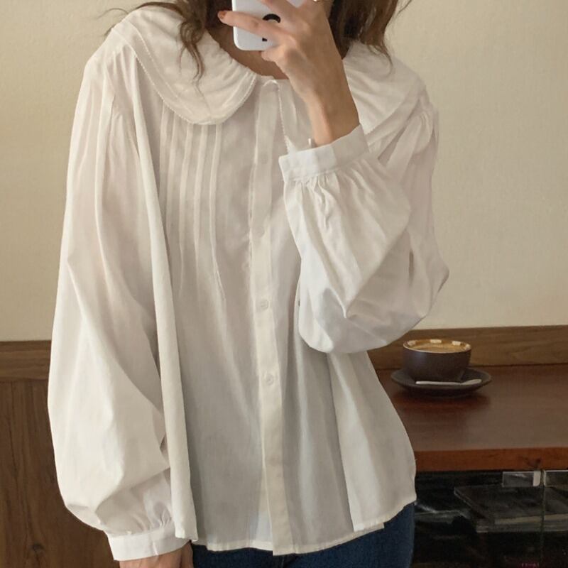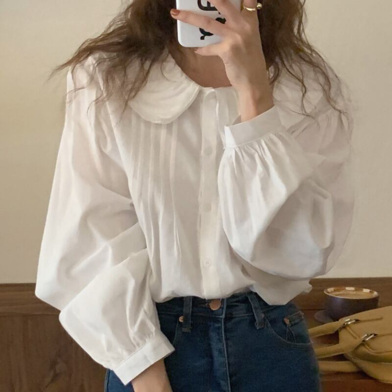 オータムダブルカラープリーツスリーブルーズホワイトシャツ ランタンスリーブ 大人ガーリー スウィート キュート カジュアル 秋物 韓国婦人54725156605