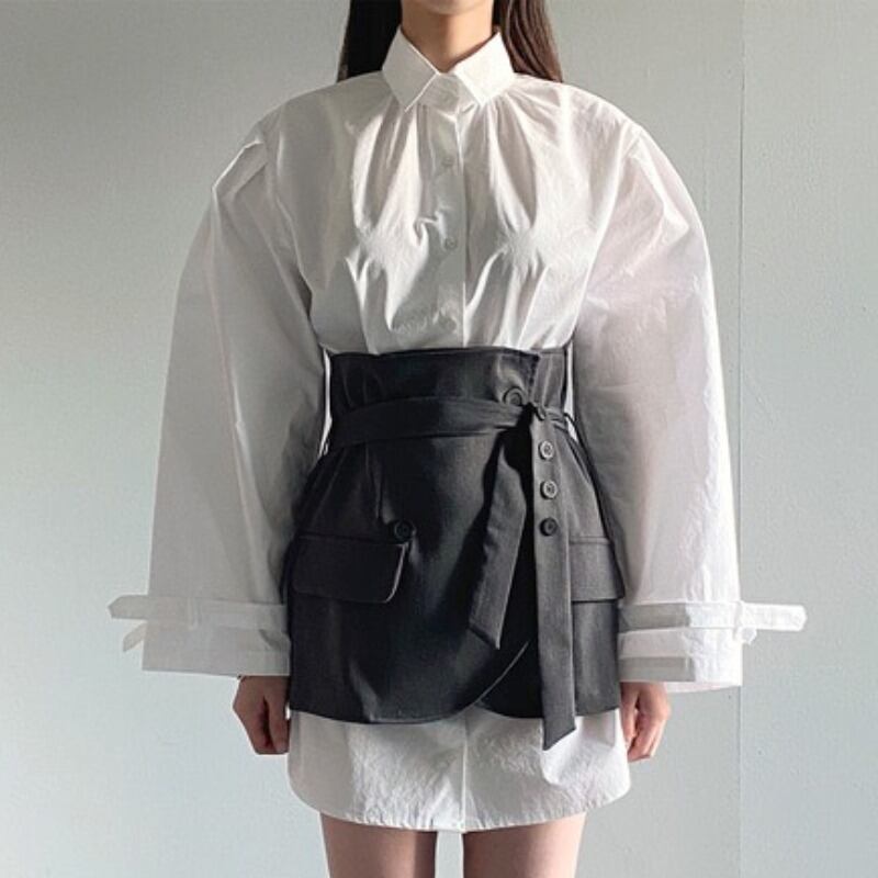オータムスリーブシャツ ドレス ダブルブレストスカート レディース ランタンスリーブ レース 秋物 レースアップ 韓国婦人8155232141