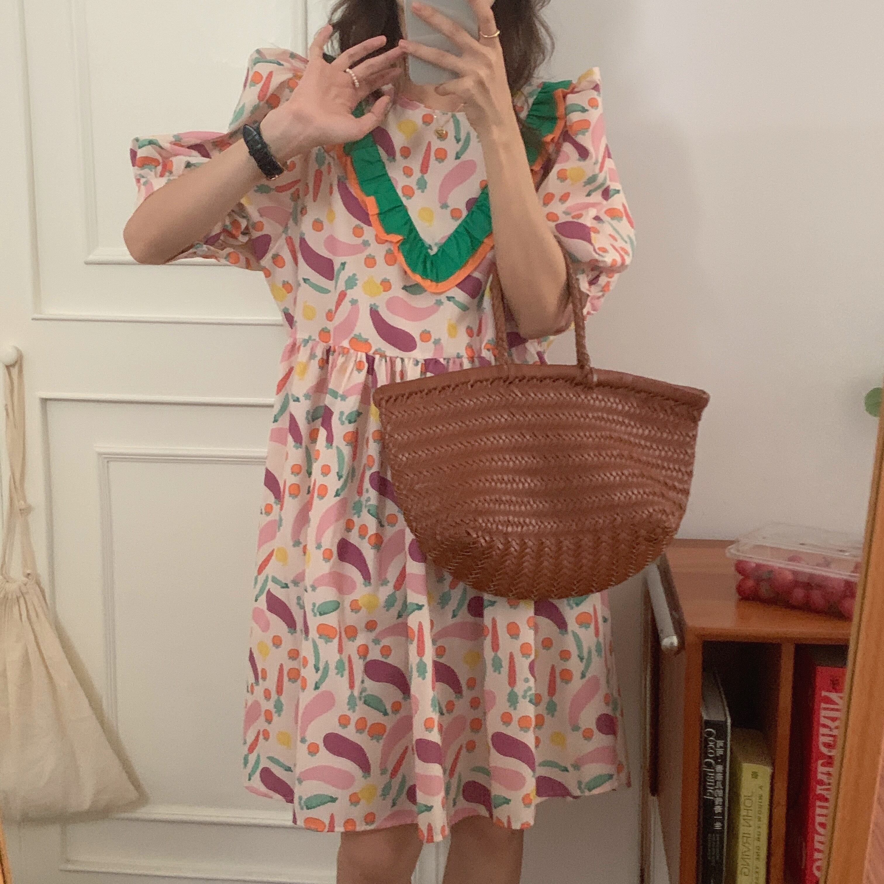 サマーカラーレーススリーブ薄手プリント柄ドレス 大人ガーリー スウィート キュート カジュアル 夏物 韓国婦人57511454110