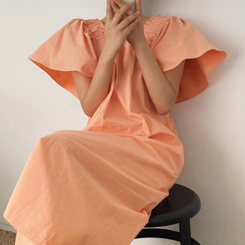 Vネックスタンダードソリッド カラールーズドレス ロングスカート サマー レッド レトロ 夏物 ソリッドカラー 韓国婦人32989230659