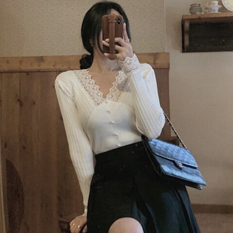 オータムレースVネックスリムセーター トップス レディース 秋物 ステッチ 韓国婦人55166979647