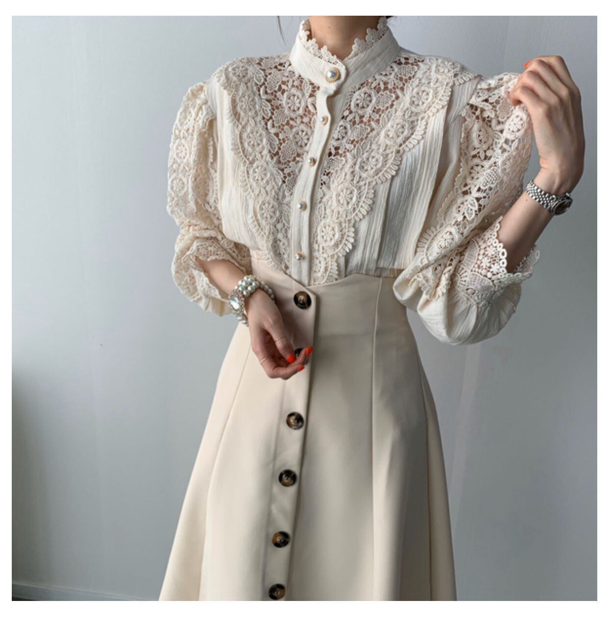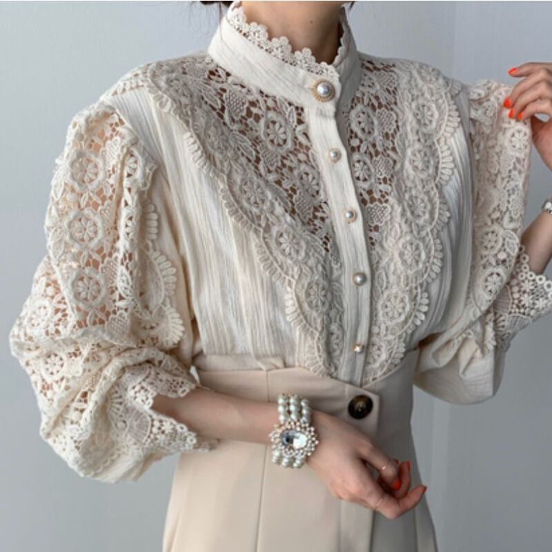 オータムスタンダードカラーレースパールスリーブシャツ トップス レディース レトロ 秋物 真珠 ステッチ 韓国婦人19156677539