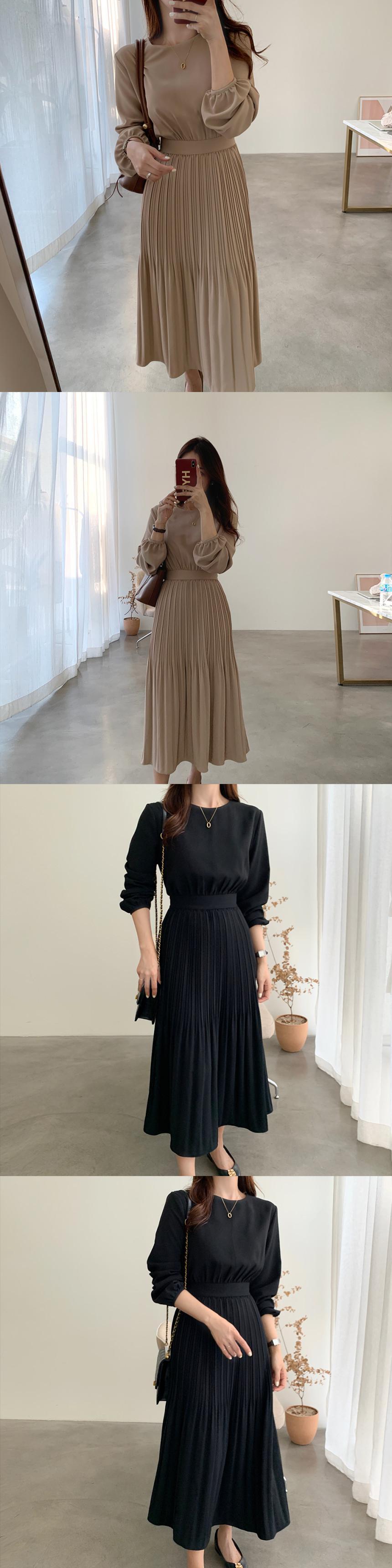 オータムスタイルラウンドネックプリーツウェスト長袖スリーブドレス レディース ロング 秋物 Oネック 韓国婦人77698756950