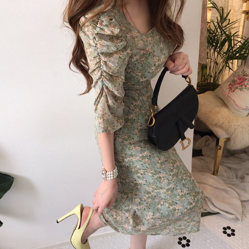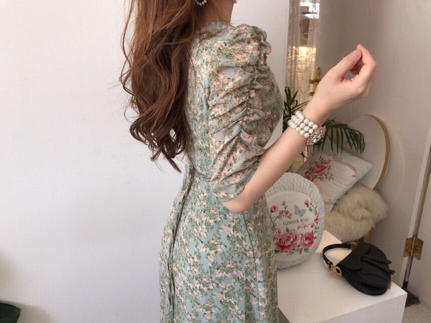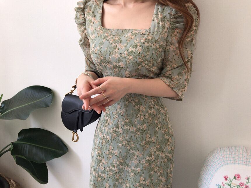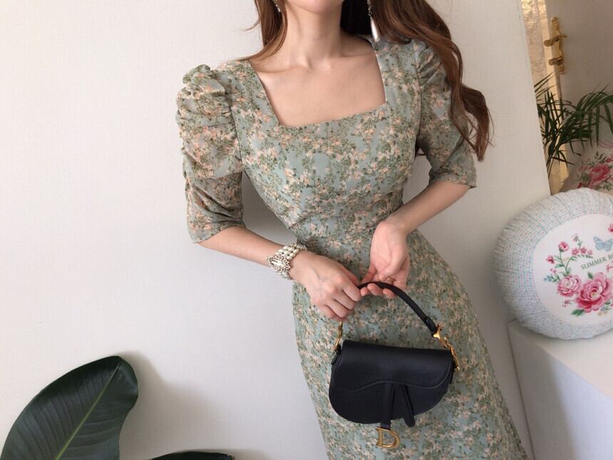 サマーカラープリーツレースフローラルドレス レディース 夏物 花柄 スクウェア 韓国婦人43153580630