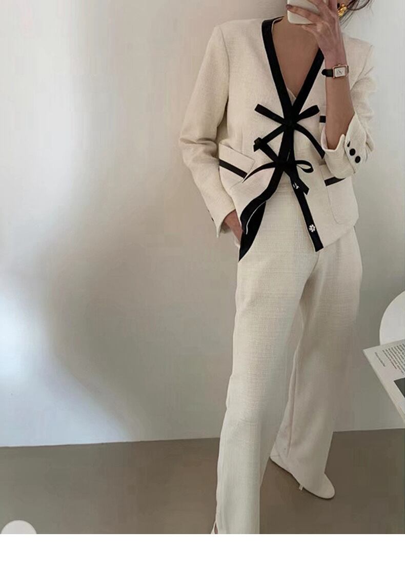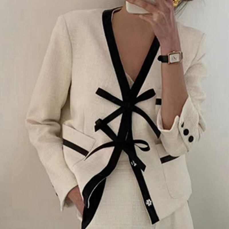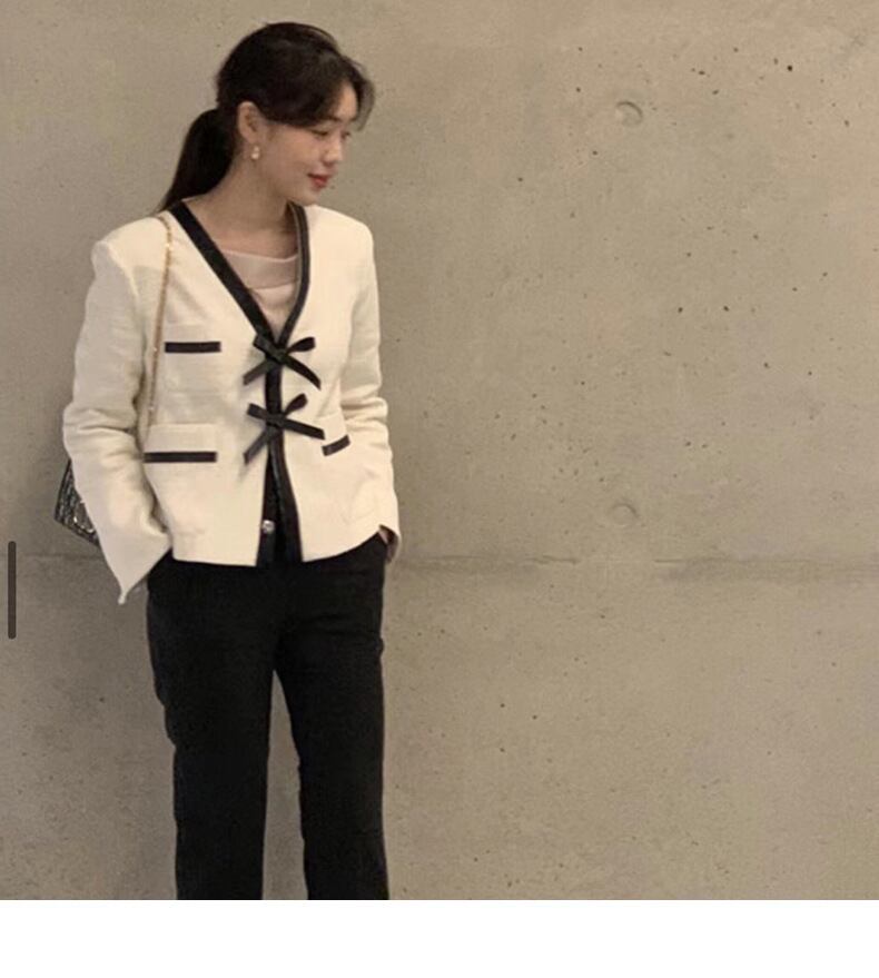オータムレザーカラーリボンVネックツィードカーディガンジャケット レディース エレガント 秋物 ステッチ 韓国婦人88673622971