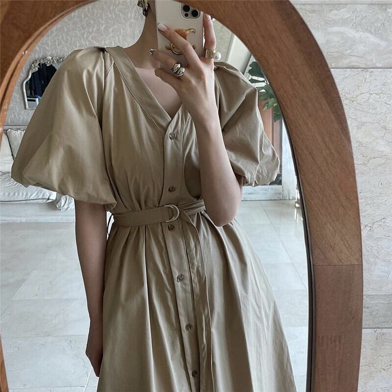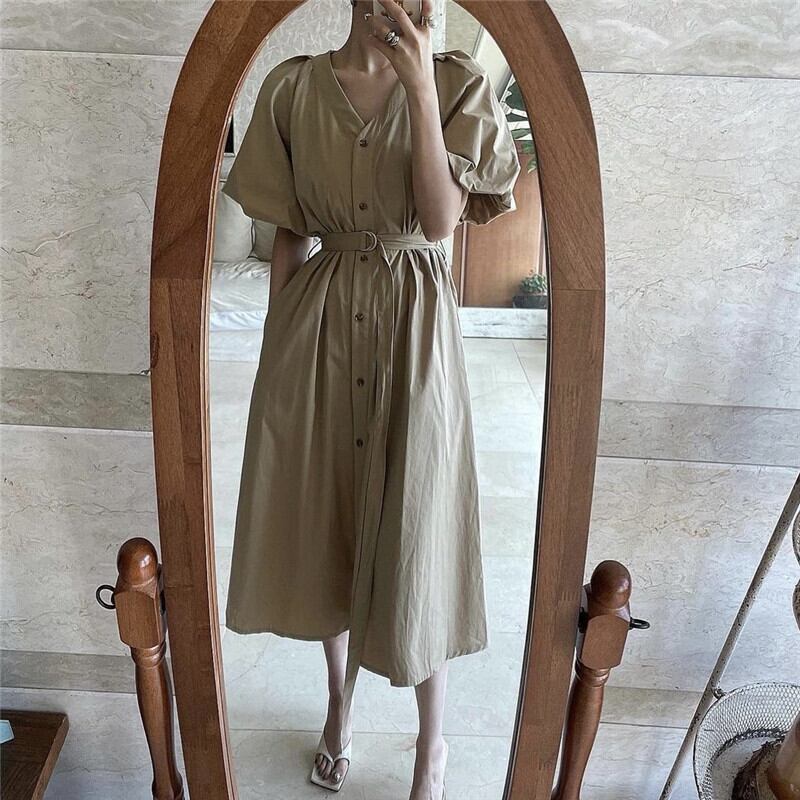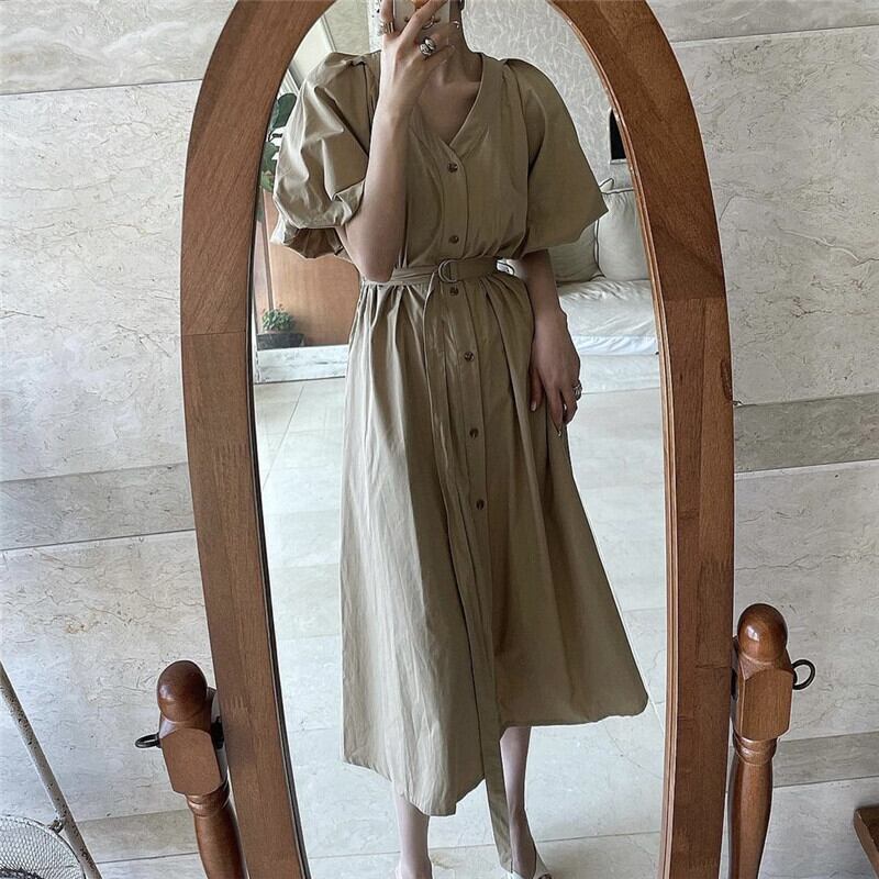 サマースタンダードVネックベルト スリーブドレス レトロ 夏物 ハーネス 韓国婦人27907940474