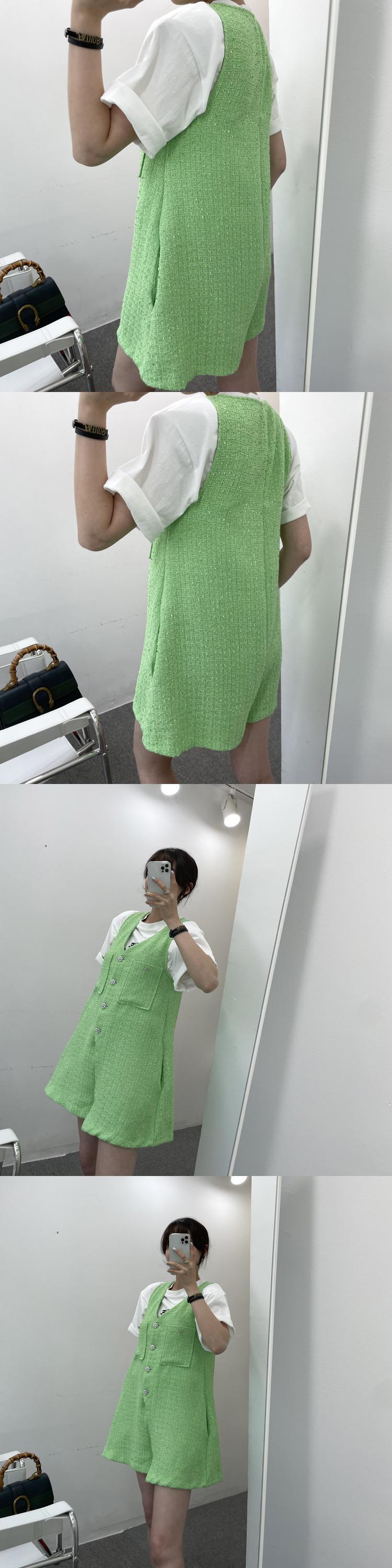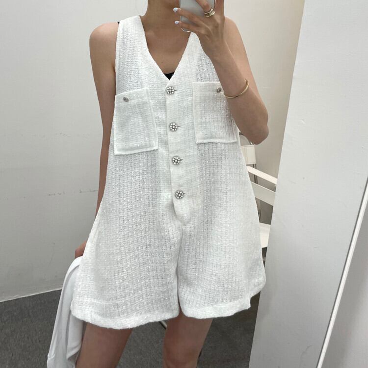 サマーVネックパールバックルダブルポケットツィードカジュアルジャンプスーツ オールインワン ショーツ レディース ストリート 夏物 ブルマー 真珠 韓国婦人77215595039