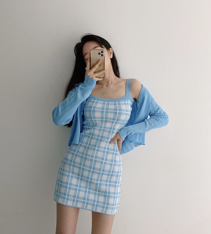 色:ブルーカーディガン,ピンクのカーディガン,ブルーキャミソール,ピンクのサスペンダースカート