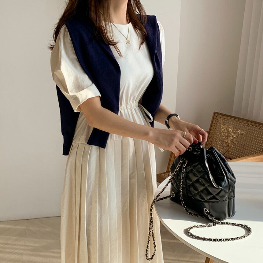 サマードレス ラウンドネックホワイトギャザースリーブスカート 夏物 Oネック フラワーデザイン 韓国婦人72514298347