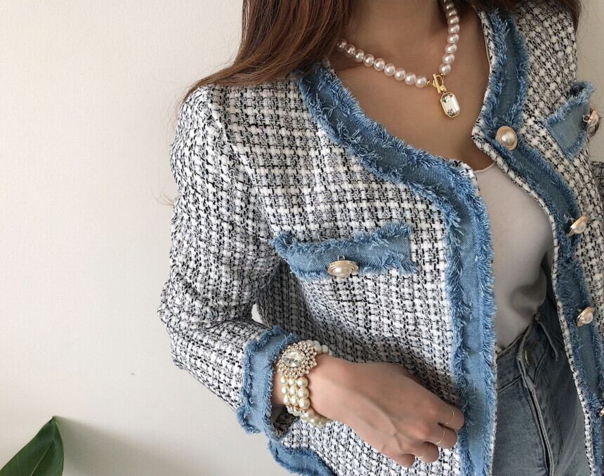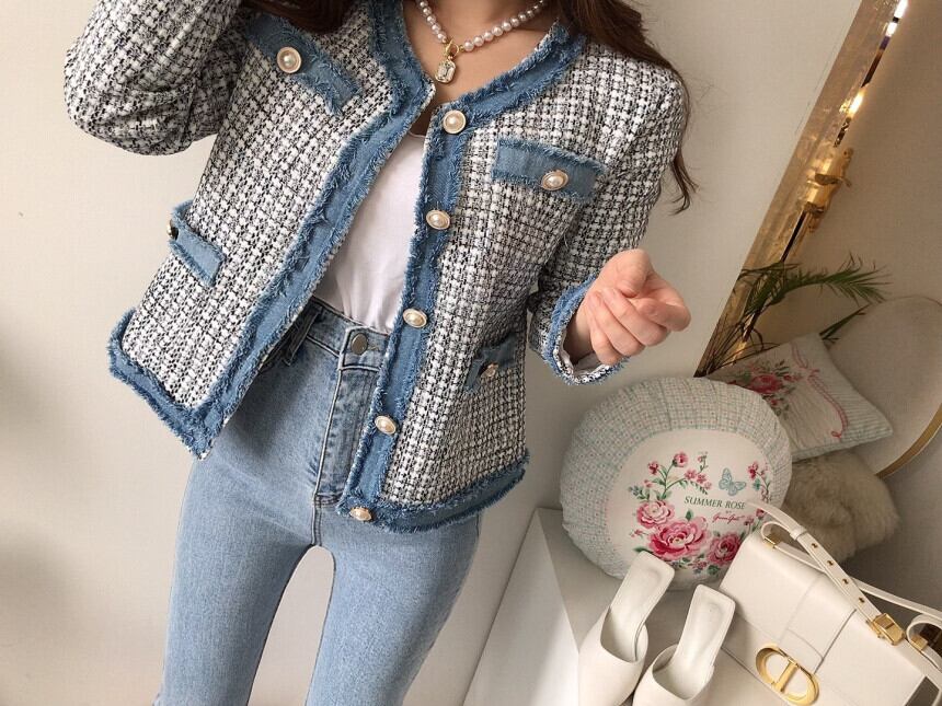 オータムウィンタースタンダードラウンドネックレースパールバックルツィード格子柄ショートジャケット レディース レトロ 秋物 冬物 Oネック 真珠 韓国婦人85723253117