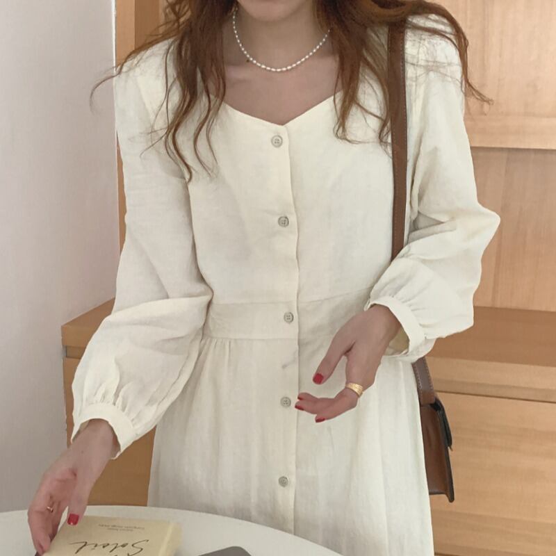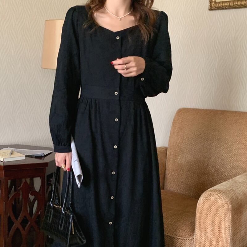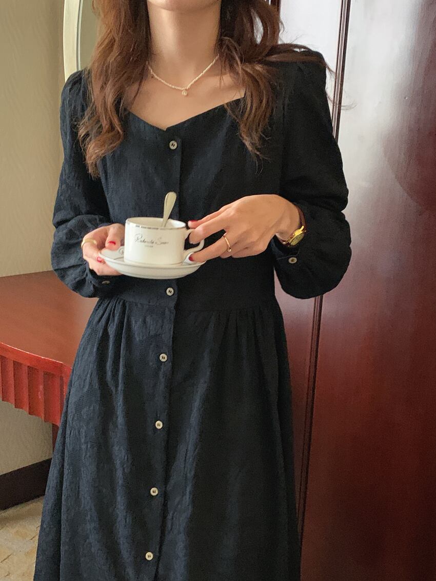 オータムカラーウェストジャカードドレス ロング 秋物 スクウェア 韓国婦人49116607398