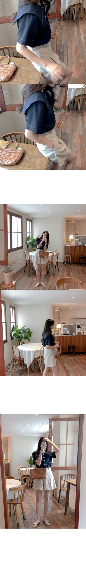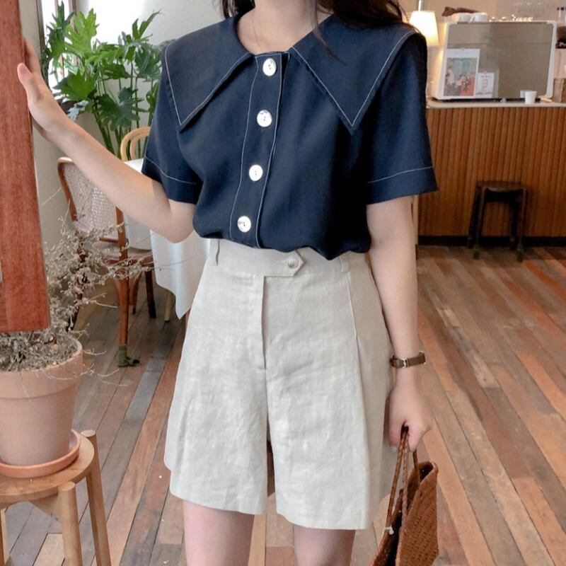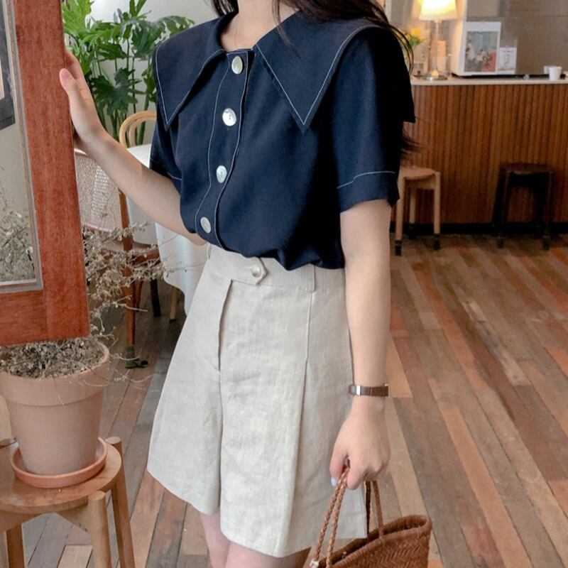サマースタンダードカラーネイビーカジュアルルーズスリーブシャツ レトロ 夏物 韓国婦人44537987407