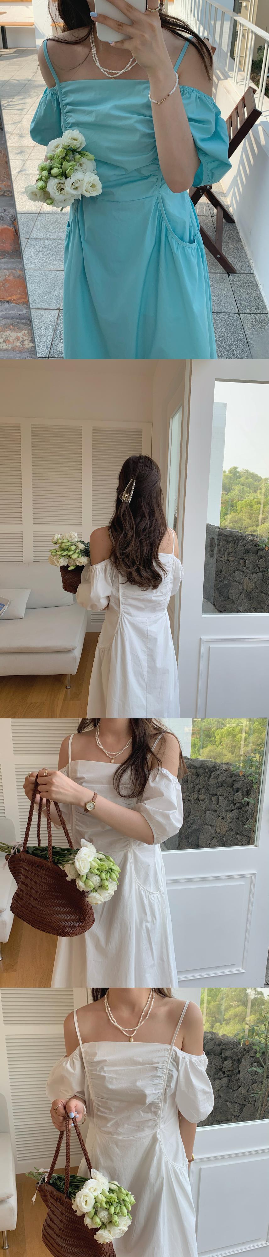 サマーダブルポケットドレス ロングスカート 夏物 オフショルダー 韓国婦人14679505670