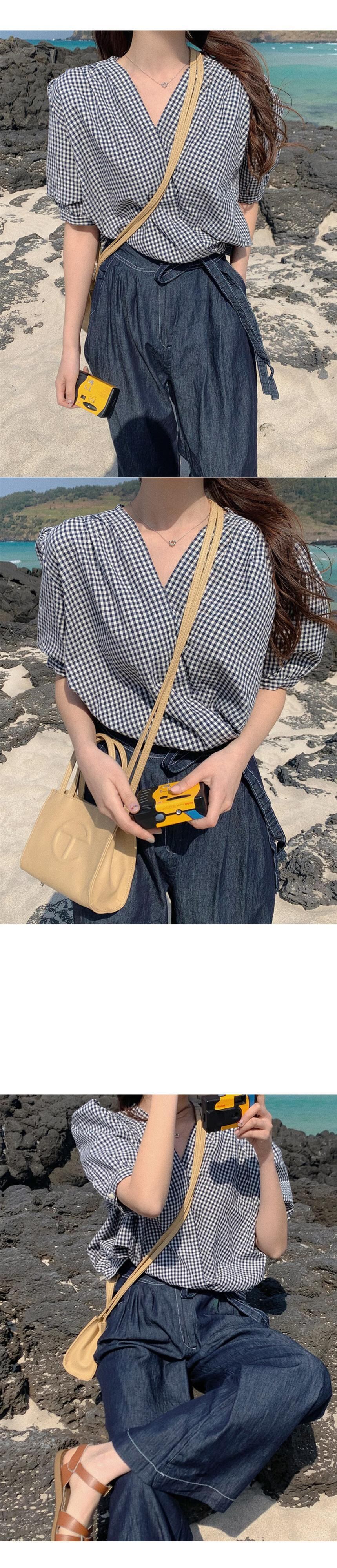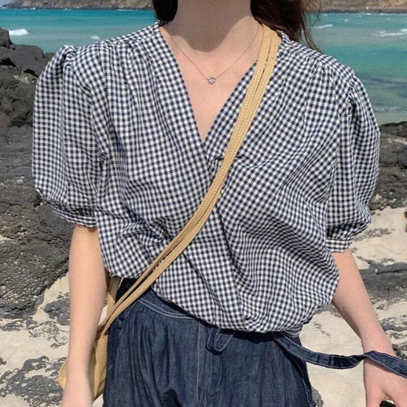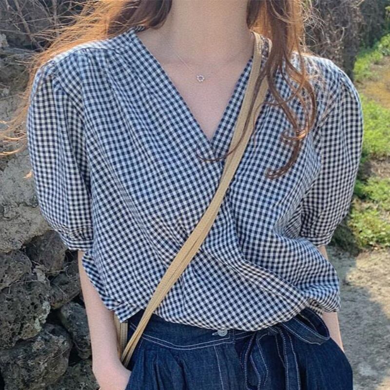 シャツ クロスカラースタイルスタンダードスリーブルーズショート格子柄トップス レトロ 韓国婦人46636290634