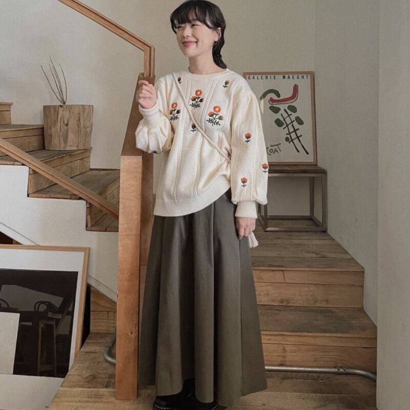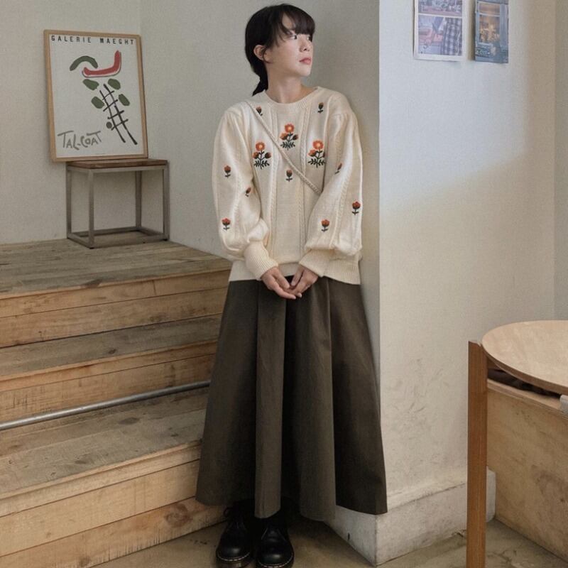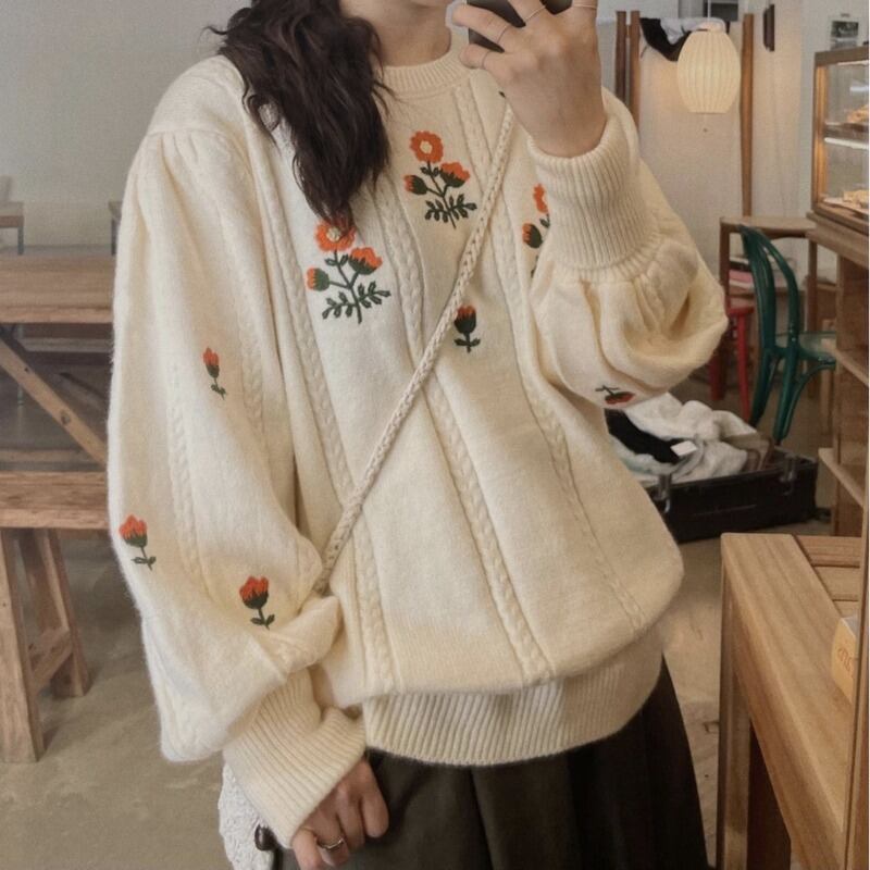 オータムウィンターラウンドネックスタイルスリーブルーズFlowerデザイン 刺繍ニットセーター レディース ランタンスリーブ 秋物 冬物 Oネック フラワーデザイン 韓国婦人58579802471