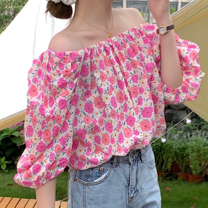 サマーホワイトスリーブフローラルシャツ トップス レディース 大人ガーリー スウィート キュート カジュアル 夏物 花柄 韓国婦人66896106977