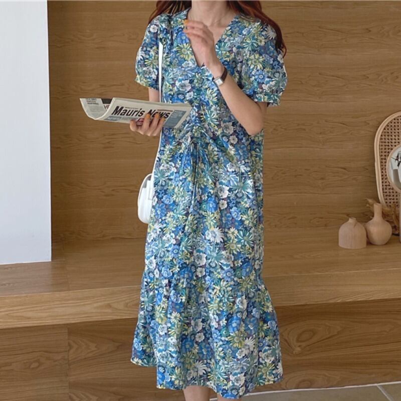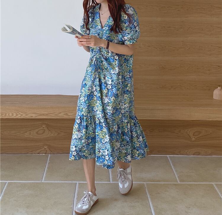 フローラルVネックプリーツルーズスリーブラッフルドレス サマー 夏物 花柄 韓国婦人46483603919