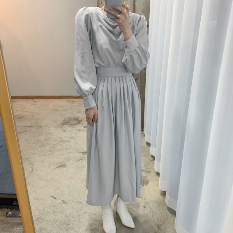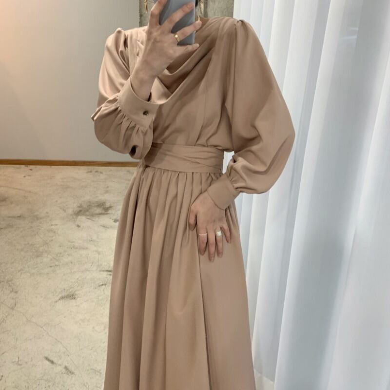 オータムウィンターカラーウェスト薄手ソリッド スリーブロングドレス ランタンスリーブ エレガント 秋物 冬物 ソリッドカラー 韓国婦人33336696448