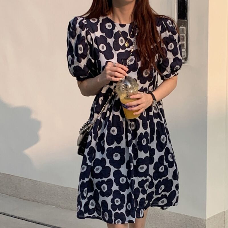 サマースタンダードスリーブFlowerデザイン ルーズドレス スカート レトロ 夏物 フラワーデザイン 韓国婦人61004030300