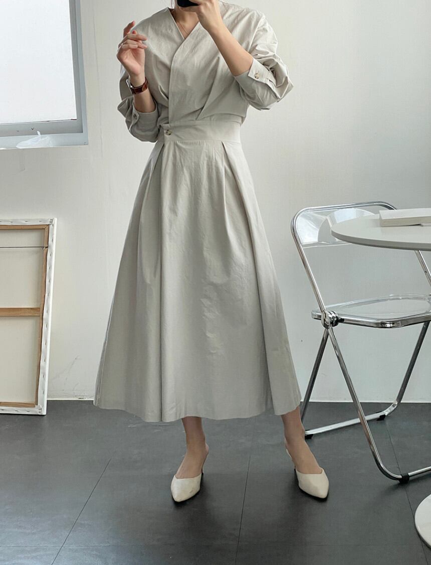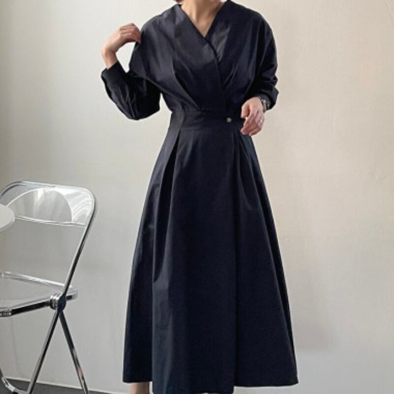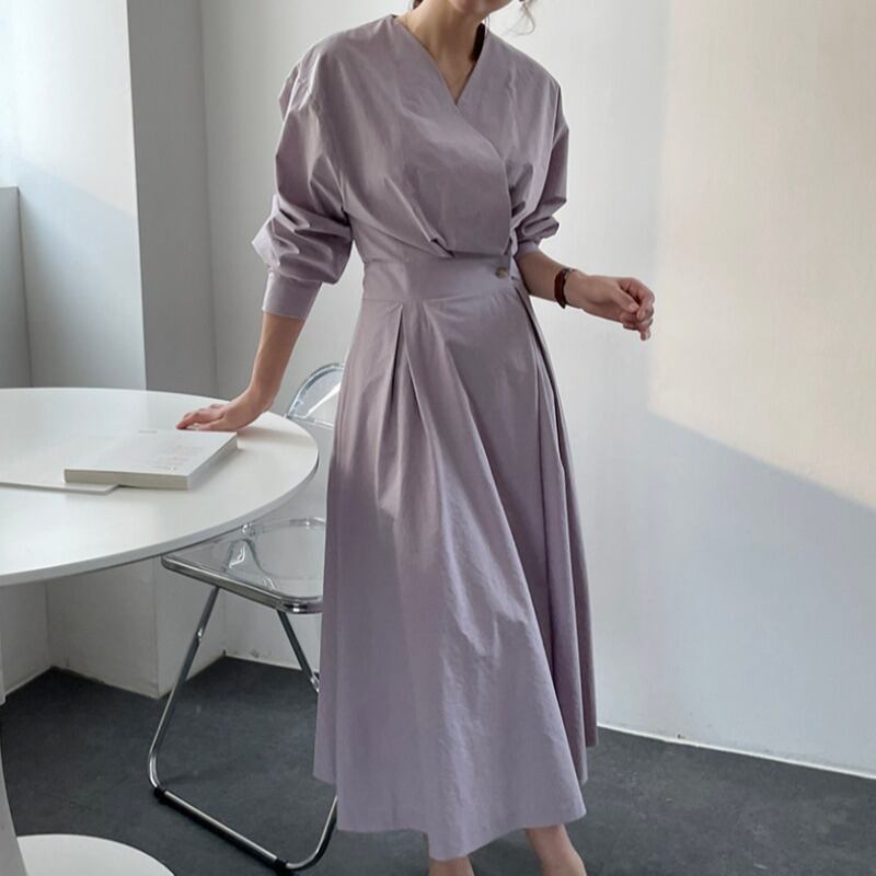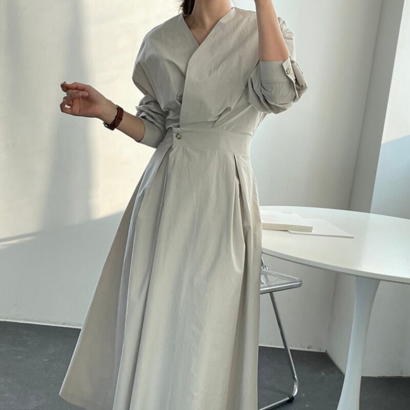 オータムスタイルVネックウェストバックルソリッド カラースリーブロングドレス レディース 秋物 ソリッドカラー 韓国婦人16173815918