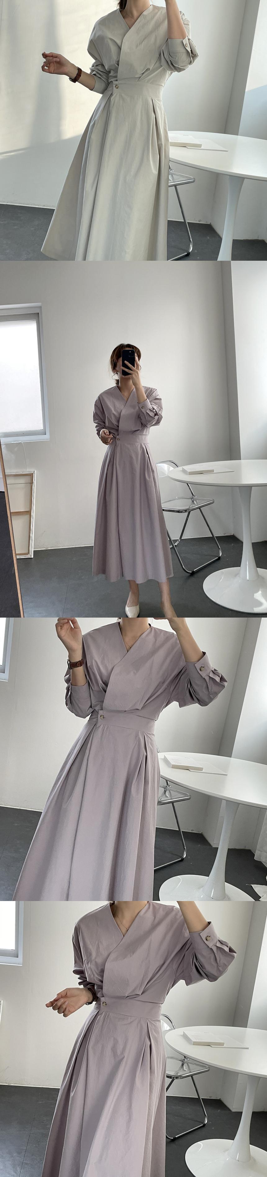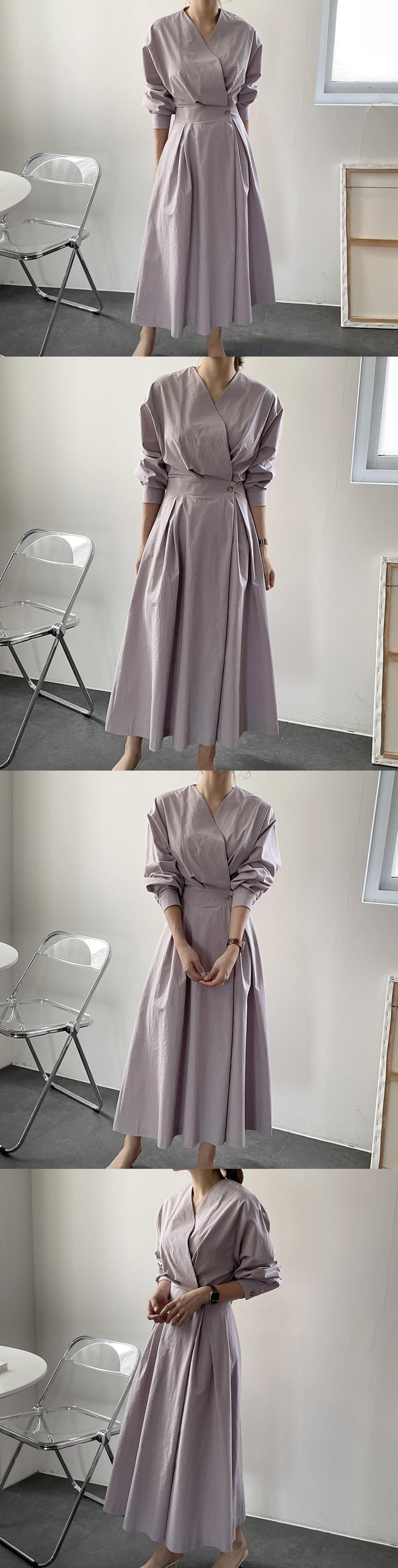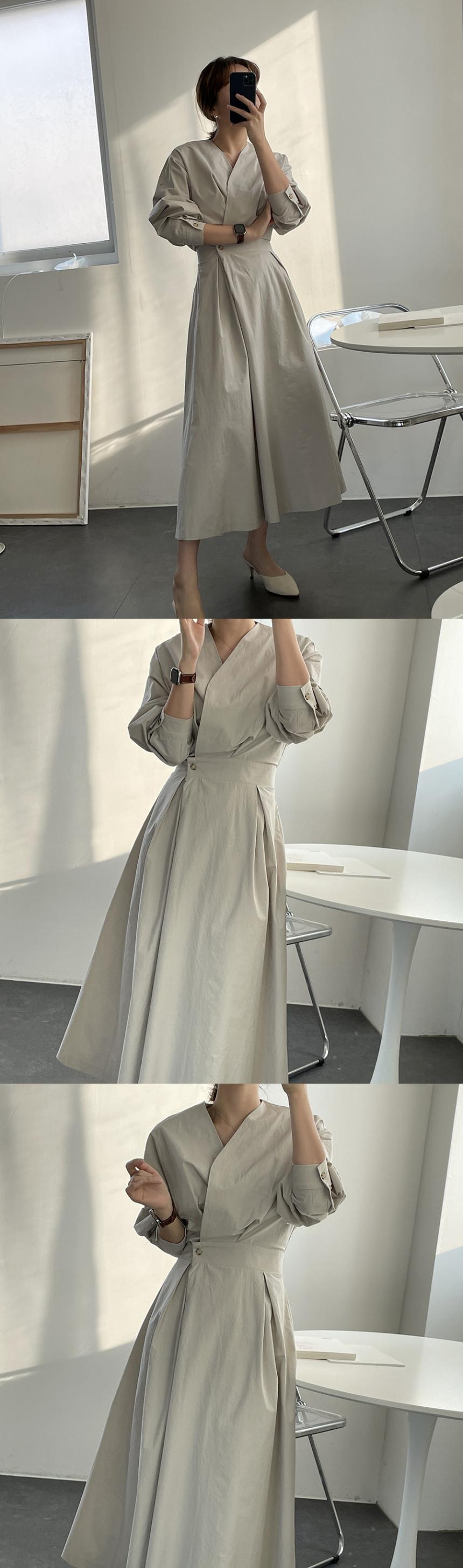 オータムスタイルVネックウェストバックルソリッド カラースリーブロングドレス レディース 秋物 ソリッドカラー 韓国婦人16173815918