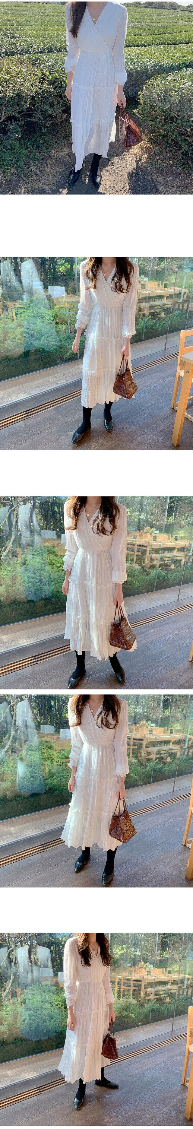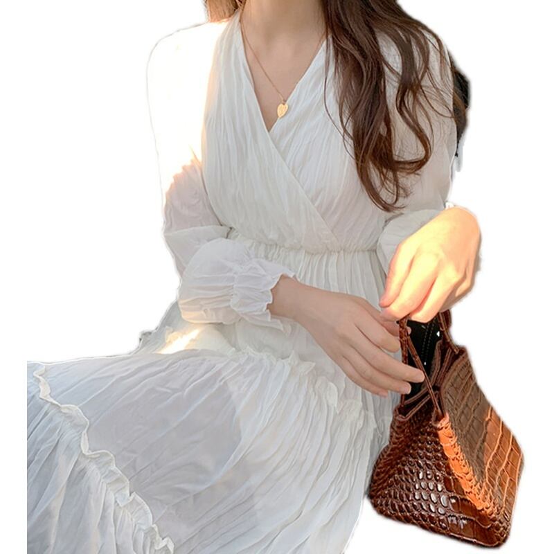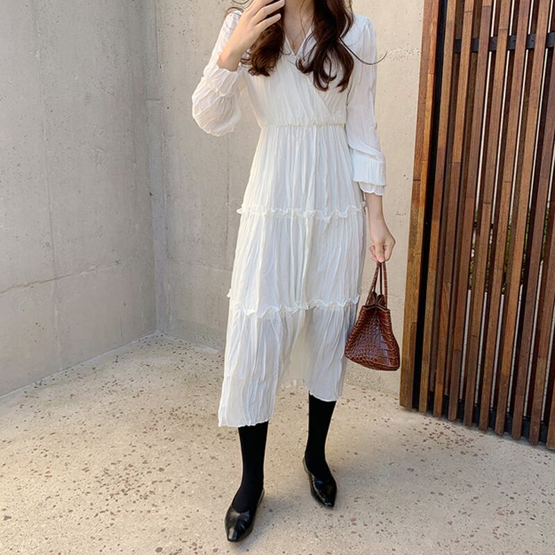 Vネックプリーツドレス ロングスカート 大人ガーリー スウィート キュート カジュアル 韓国婦人25964275815