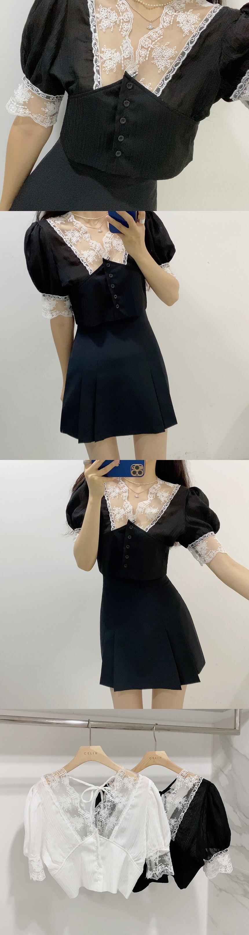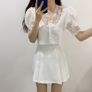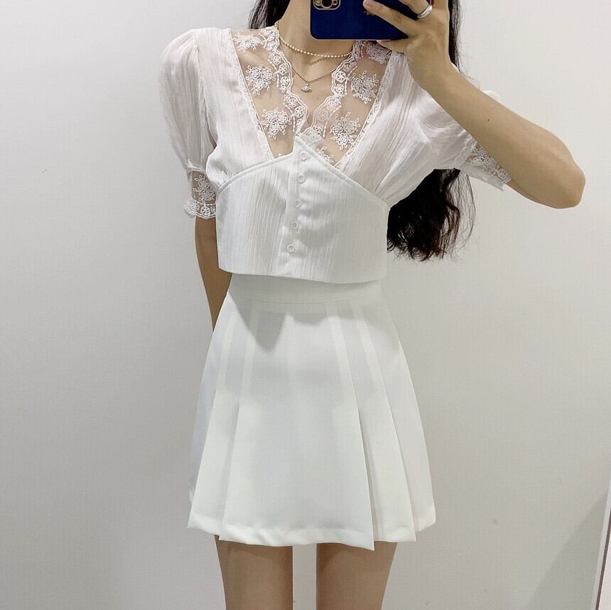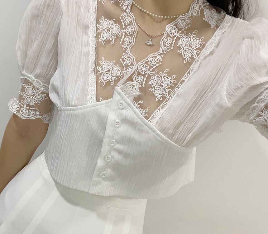 サマーレースVネックスリーブシフォンシャツ ブラウス レディース 夏物 ステッチ 韓国婦人74175694853