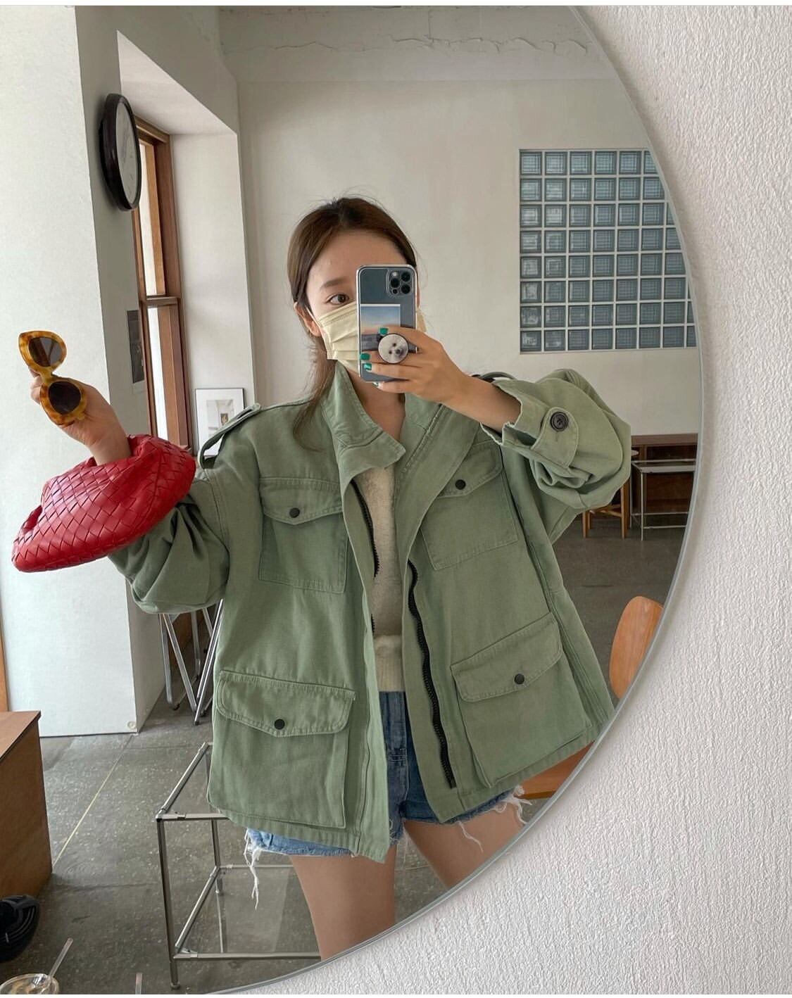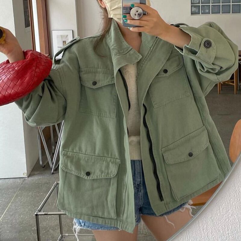 スタンダードスタイルグリーンカジュアルルーズポケットショートコート ジャケット カーディガンレディース レトロ 韓国婦人77221816606