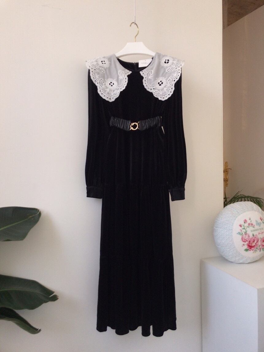 オータム刺繍カラーハイウェストウェスト長袖スリーブベルベットドレス ベルト ロング 秋物 ハーネス ステッチ 韓国婦人53474129023
