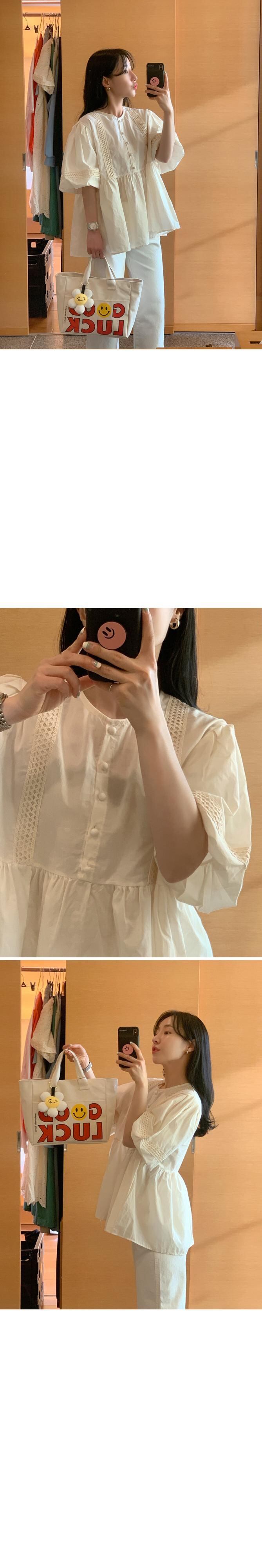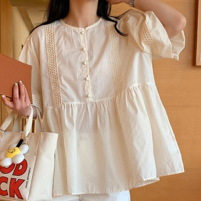 ブラウス サマーレースラウンドネックシャツ 大人ガーリー スウィート キュート カジュアル 夏物 Oネック ステッチ 韓国婦人20444011469