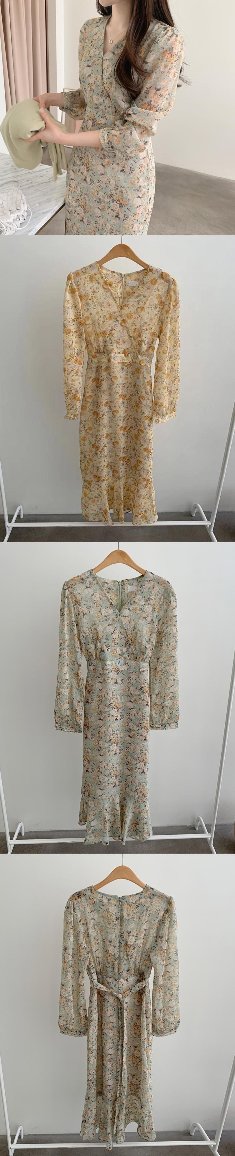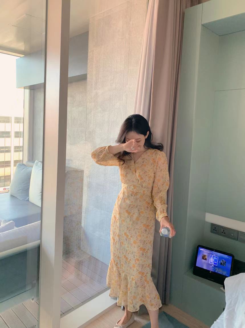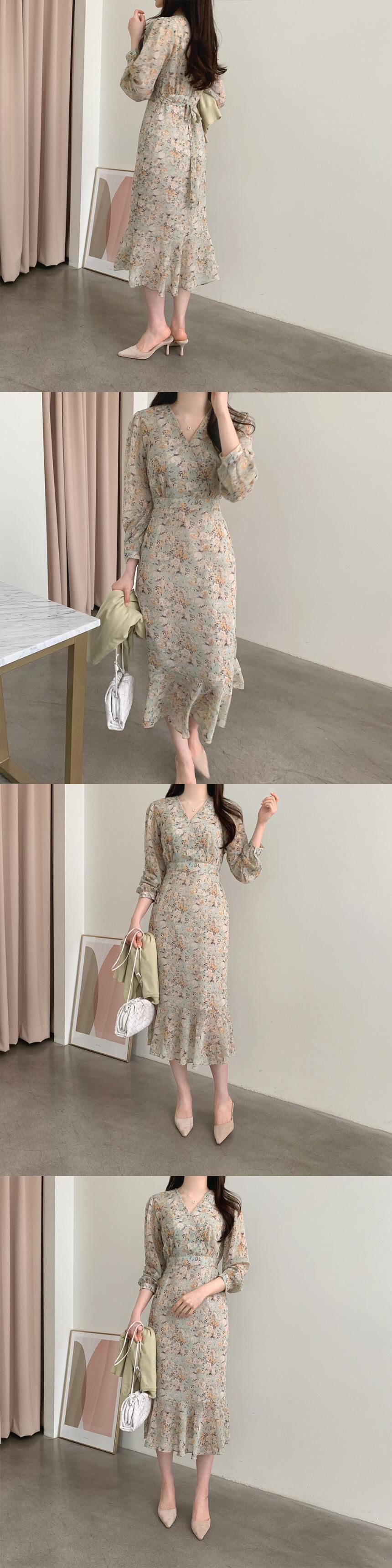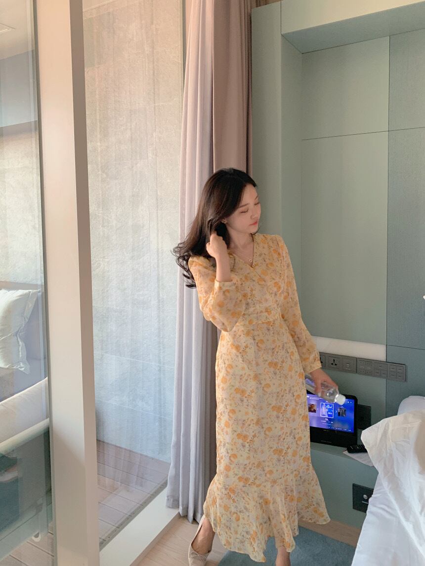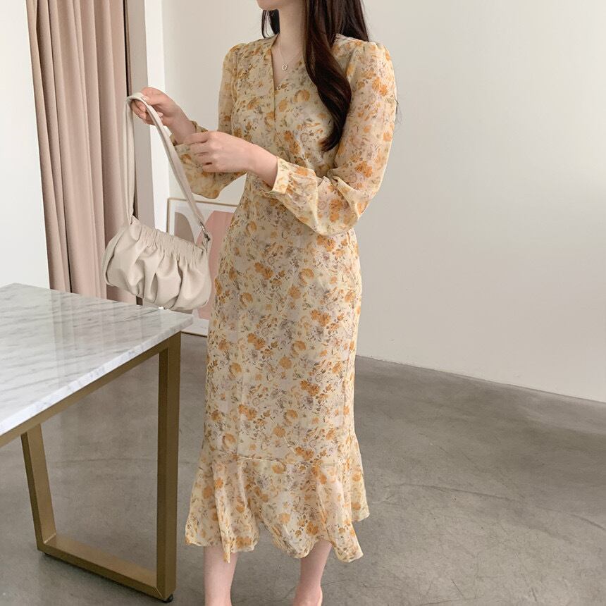 ドレス スプリングスタンダードVネックウェストフローラルロングスカート レトロ 春物 花柄 韓国婦人72864399713