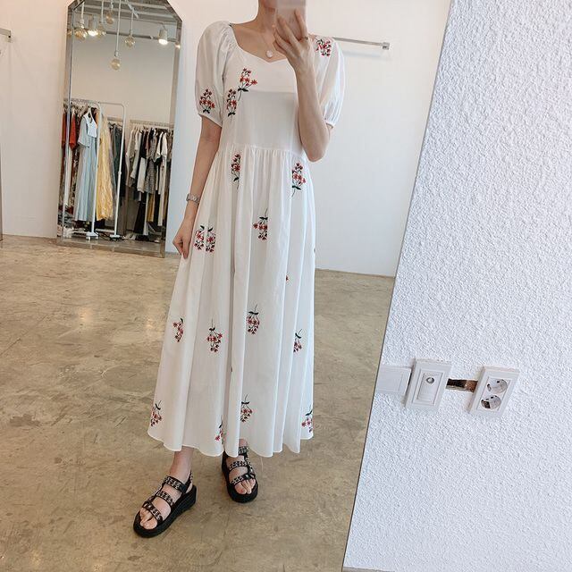 スカート サマースタイルカラー刺繍ウェストロングドレス 大人ガーリー スウィート キュート カジュアル 夏物 スクウェア 韓国婦人60260719002