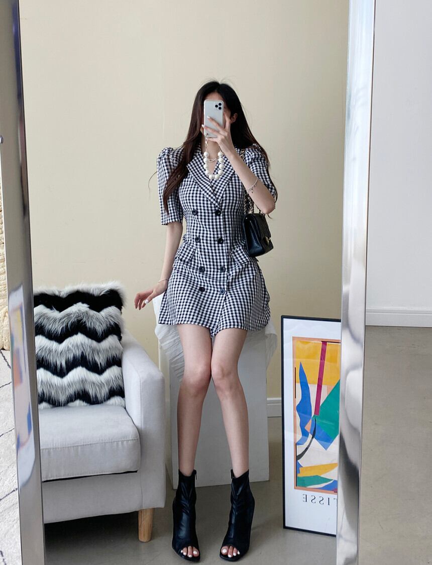 ダブルブレストスリーブブラックホワイト格子柄ドレス サマーウェスト薄手スカート 夏物 韓国婦人78476630059