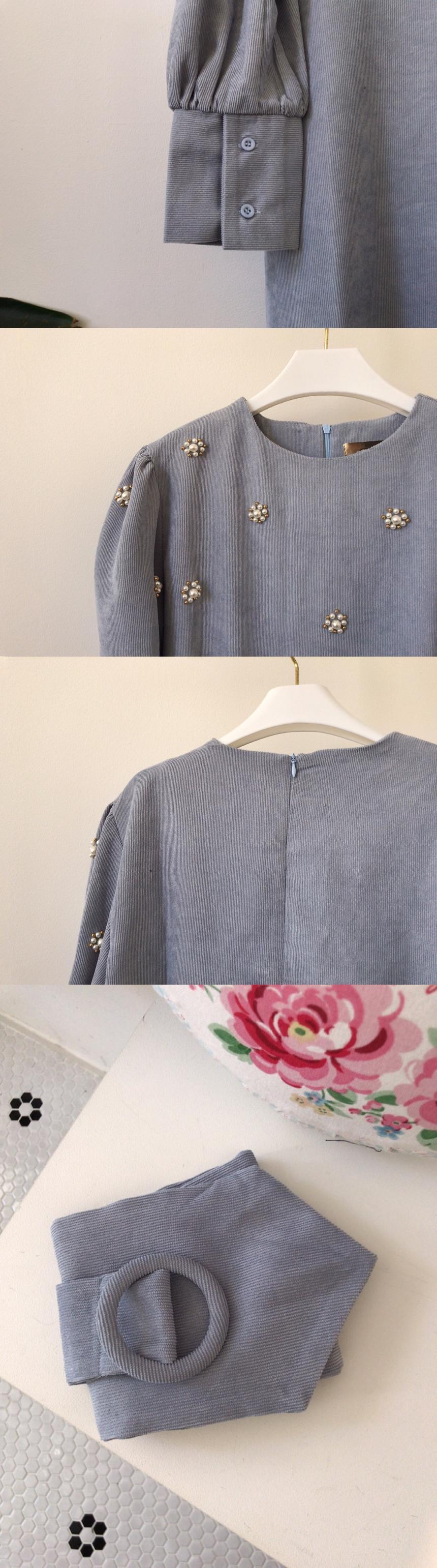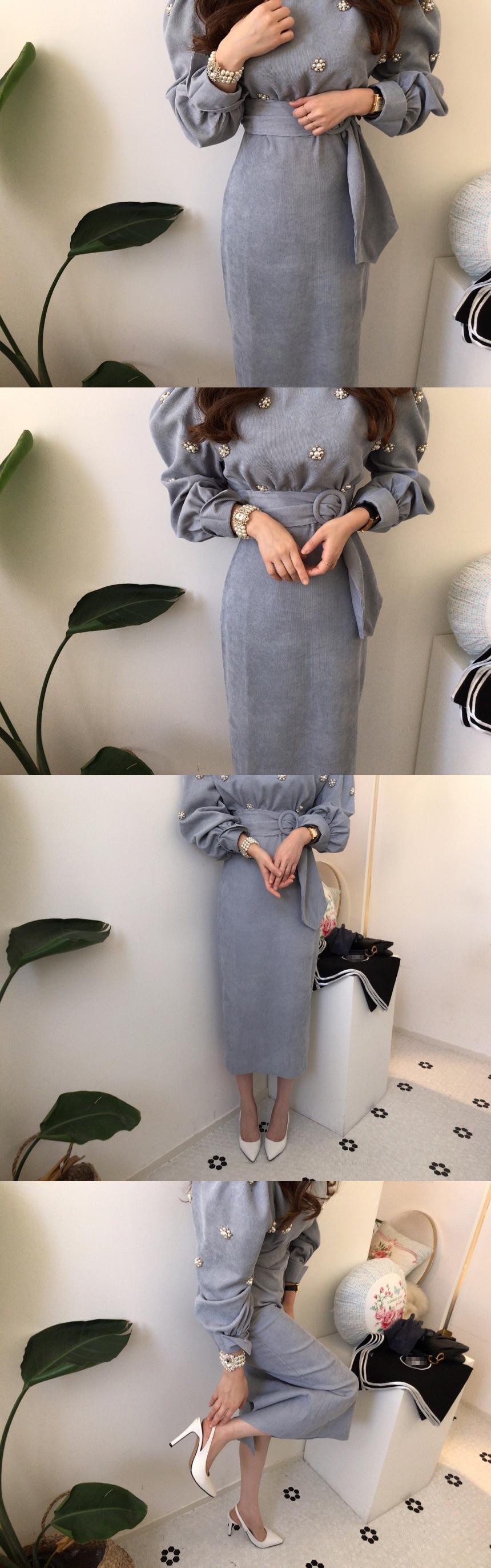 オータムウィンターFlowerデザイン ベルト 薄手スリーブコーデュロイロングドレス レディース 秋物 冬物 ハーネス フラワーデザイン 韓国婦人98590209099