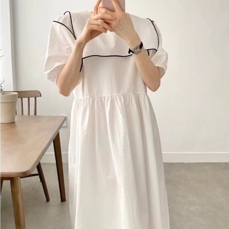 サマースタンダードカラードレス レディースルーズ薄手ロングスカート レトロ 夏物 韓国婦人92244745669