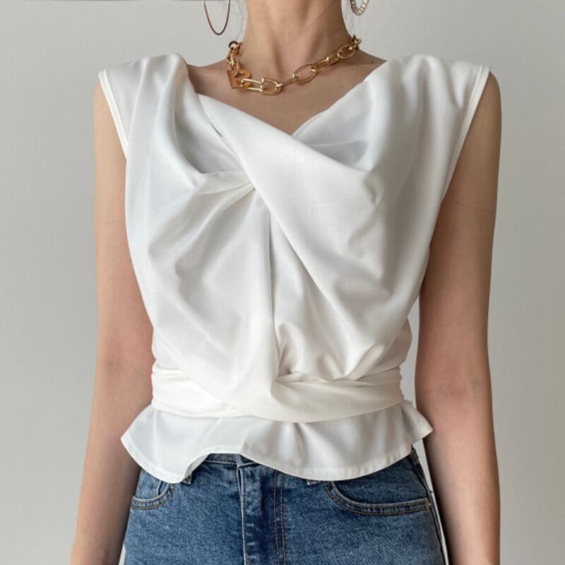 サマースタンダードクロスVネックバックリボンノースリーブシャツ トップス レディース レトロ 夏物 韓国婦人25736671378