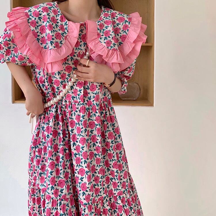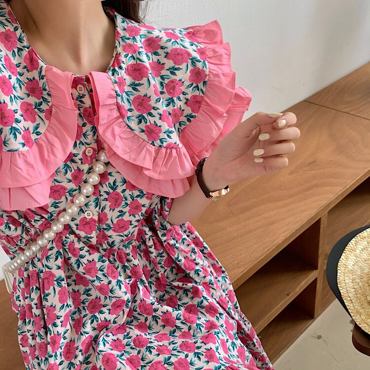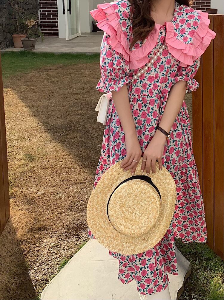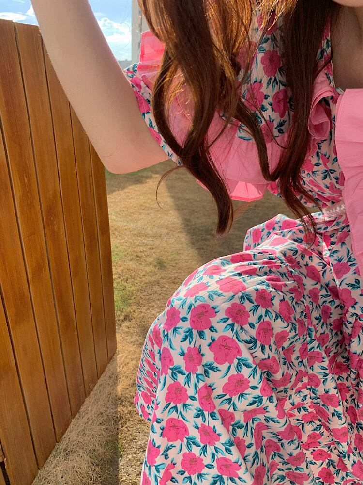 サマーカラーフローラルスリーブドレス ロングスカート ピンク 大人ガーリー スウィート キュート カジュアル 夏物 花柄 韓国婦人3362321101